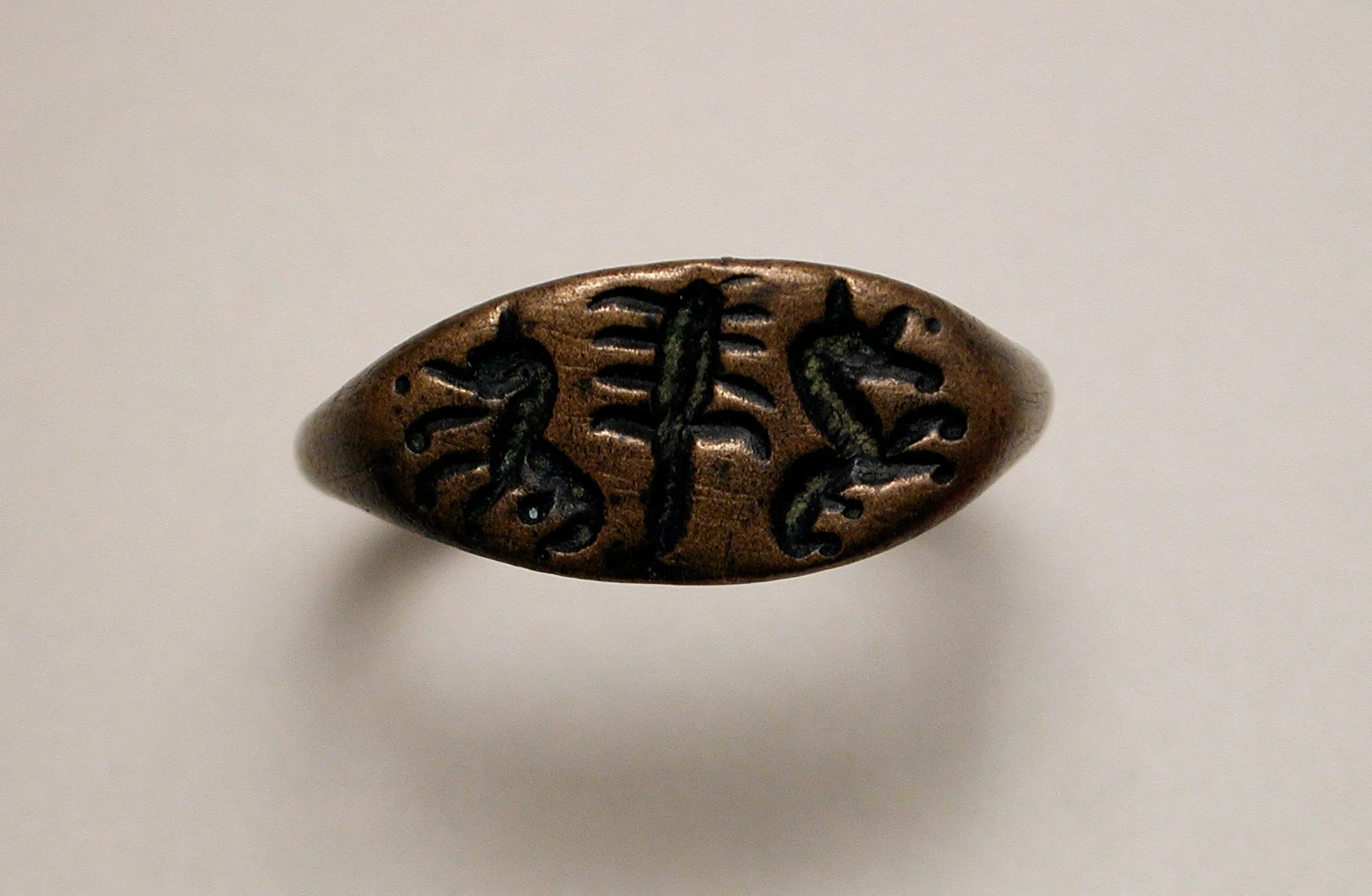 Small bronze finger ring with a lens-shaped bezel incised with a central cross-like motif flanked by curved lines and two mirrored animal figures, warm chestnut-brown patina with green toning in recessed areas