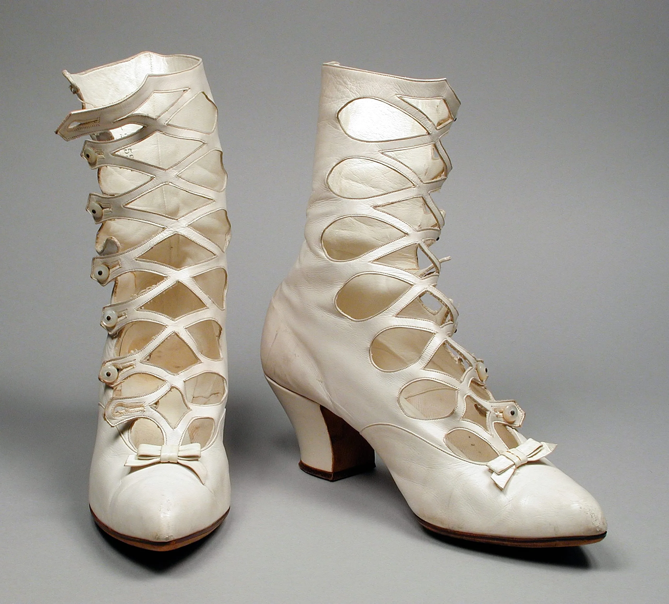 Pair of tall ivory leather boots with cut-out laced shafts, small toe bows, and curved block heels, facing forward against a gray background