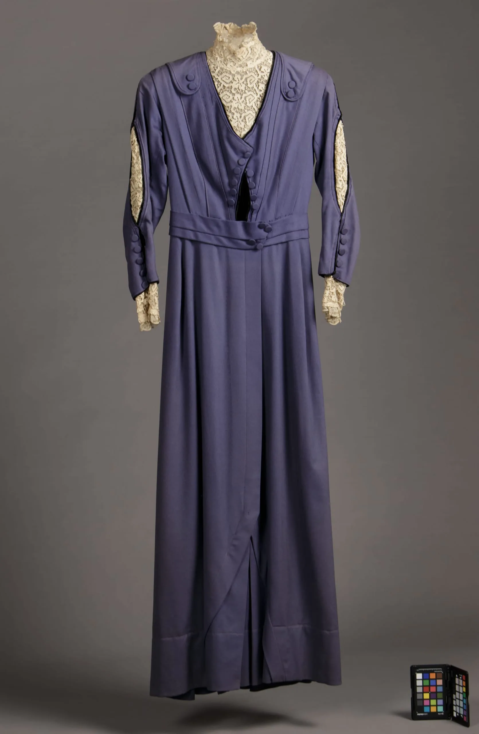 - Wool twill (broadcloth), linen lace, silk velvet trim