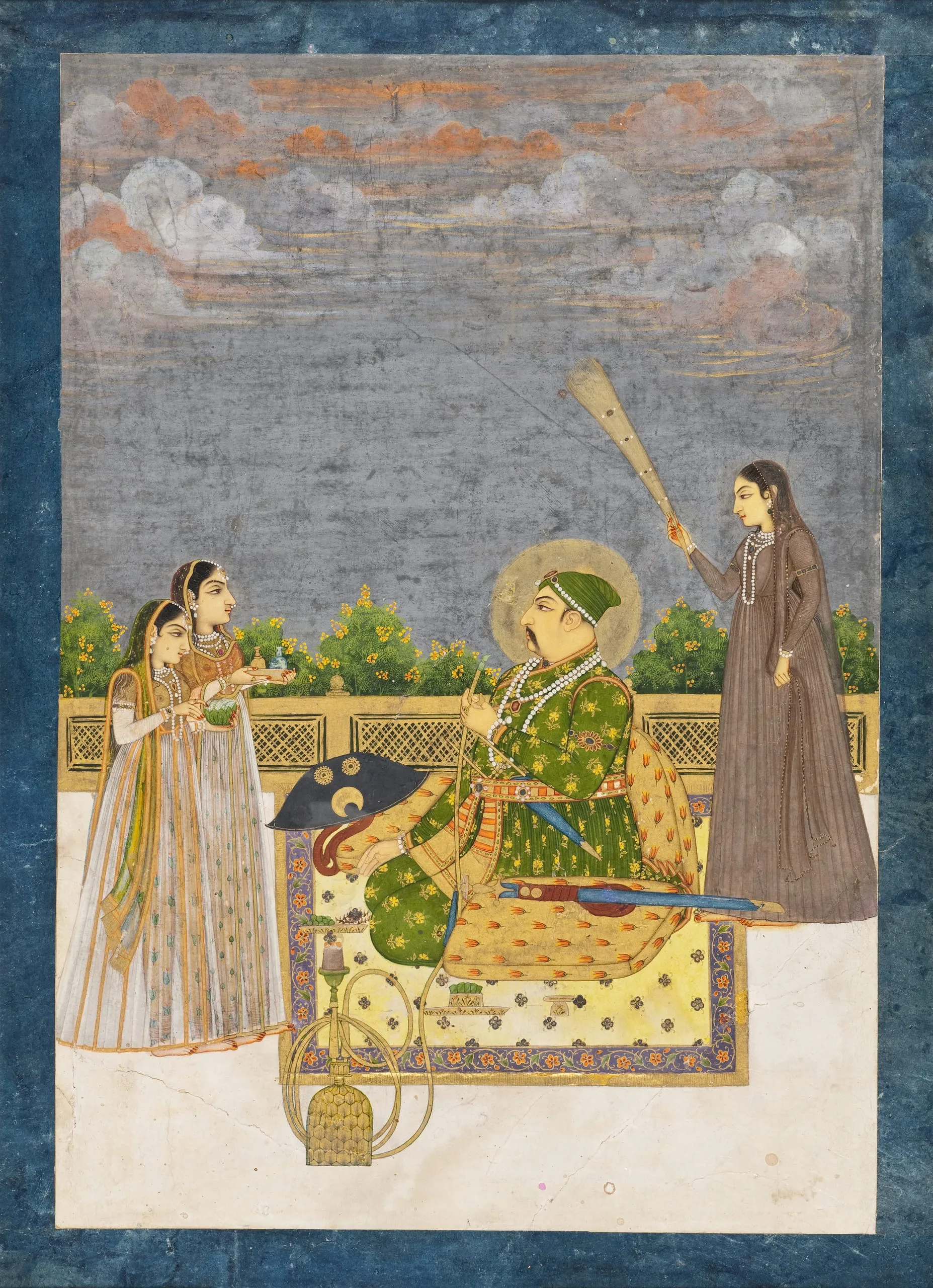 Emperor Muhammad Shah (r. 1719-1748) is identified by a Hindi inscription beneath the blue border that reads, Muhammad Shah [from] Ghazni, his birthplace and a strategically important city near Kabul, Afghanistan. He is nimbate and represented with all the customary accouterments of an Indo-Muslim monarch: his sword, shield, and dagger proclaim him a mighty warrior; the hookah and delicacies such as grapes and betel nut show that he is a man of refined tastes; and the setting--a palace terrace with serving maidens and a fly-whisk bearer--bespeaks a wealthy ruler living a luxurious life.