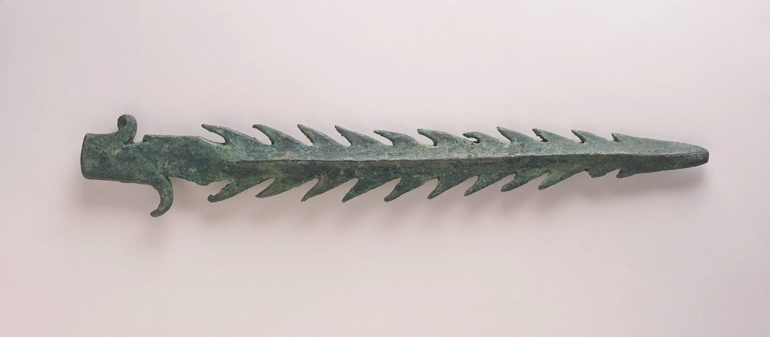 Bronze serrated implement with teal-green patina, featuring rows of triangular barbs along both edges and a socketed end with a small loop and hook