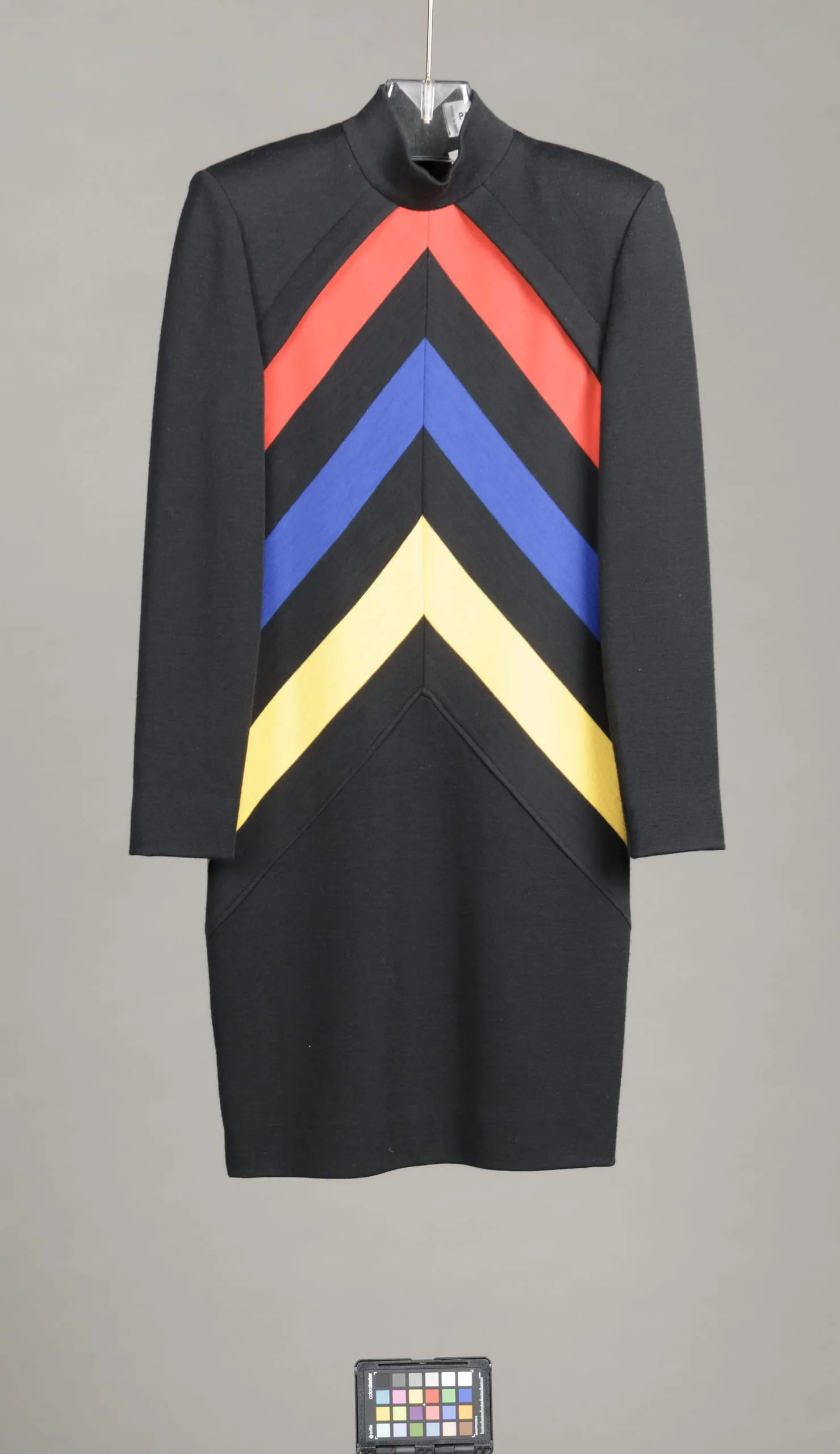 Black knee-length dress with long sleeves and stand collar, featuring three bold chevron stripes in red, blue, and yellow across the front bodice