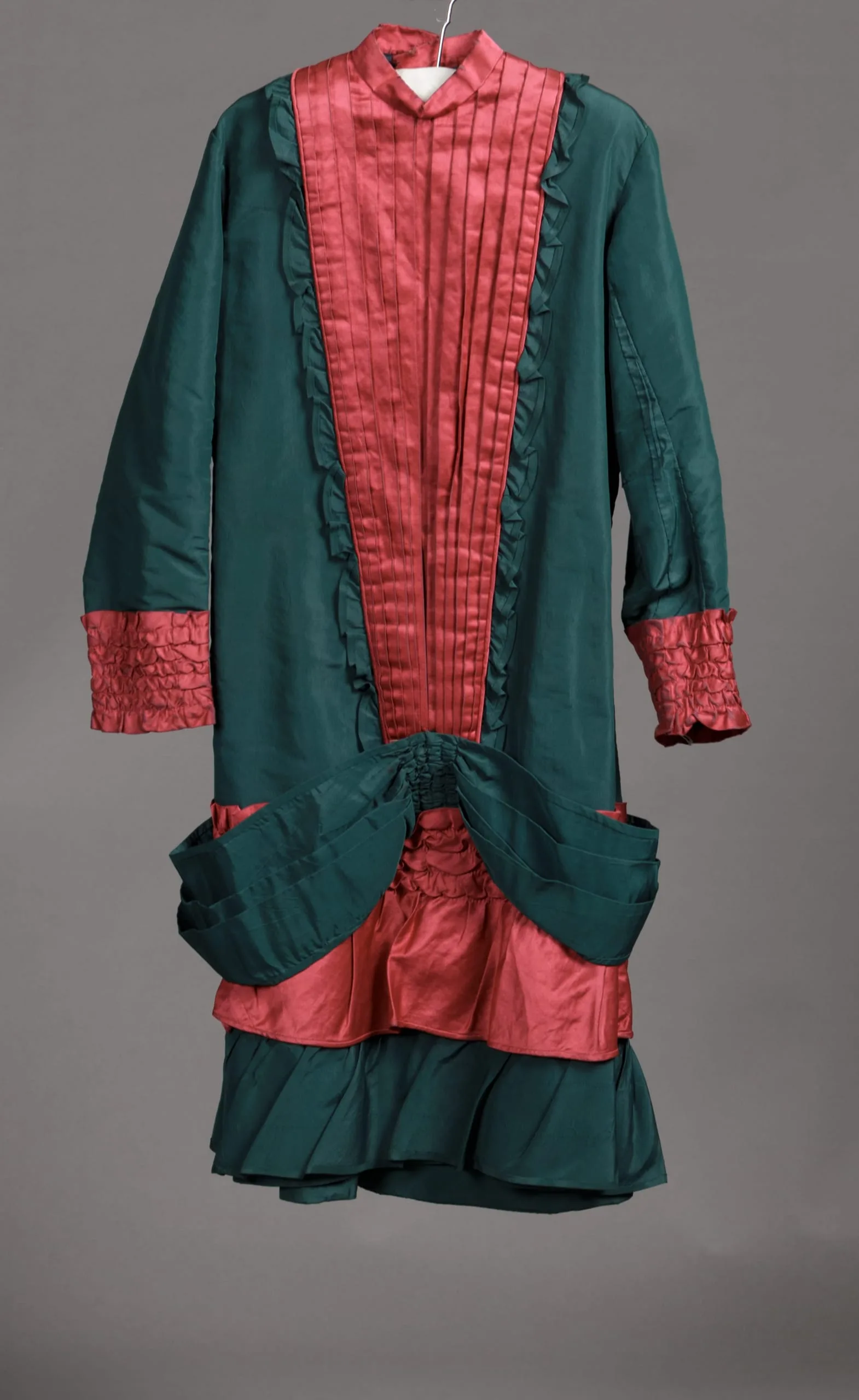Two-piece women's ensemble in teal green and dusty rose fabric, featuring a long jacket with a pleated rose center panel, smocked cuffs, draped hip panels, and a tiered skirt, consistent with late 19th-century bustle-era fashion