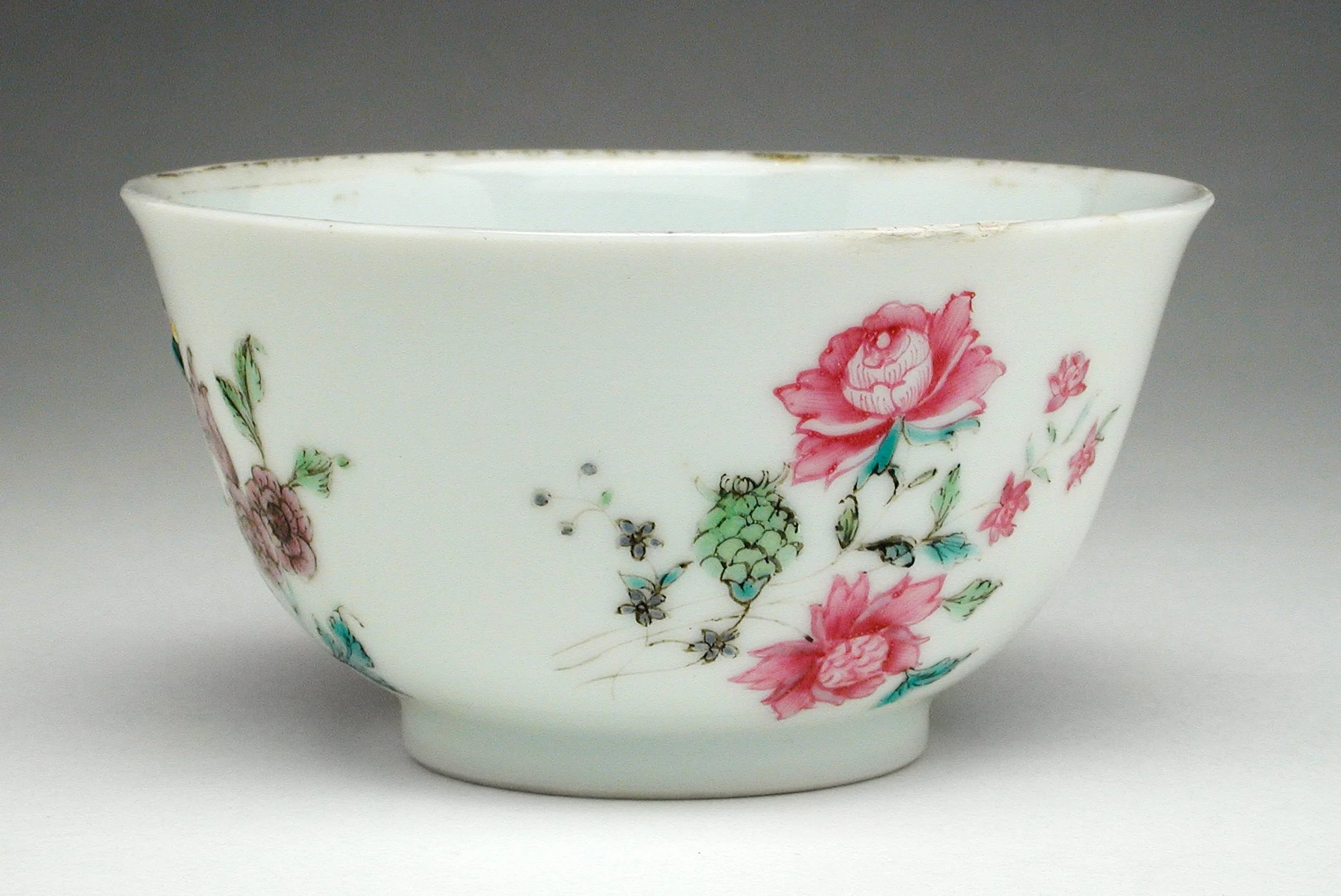 Porcelain bowl with milky white glaze, decorated with overglaze enamel floral motifs in rose pink, green, and teal on the exterior