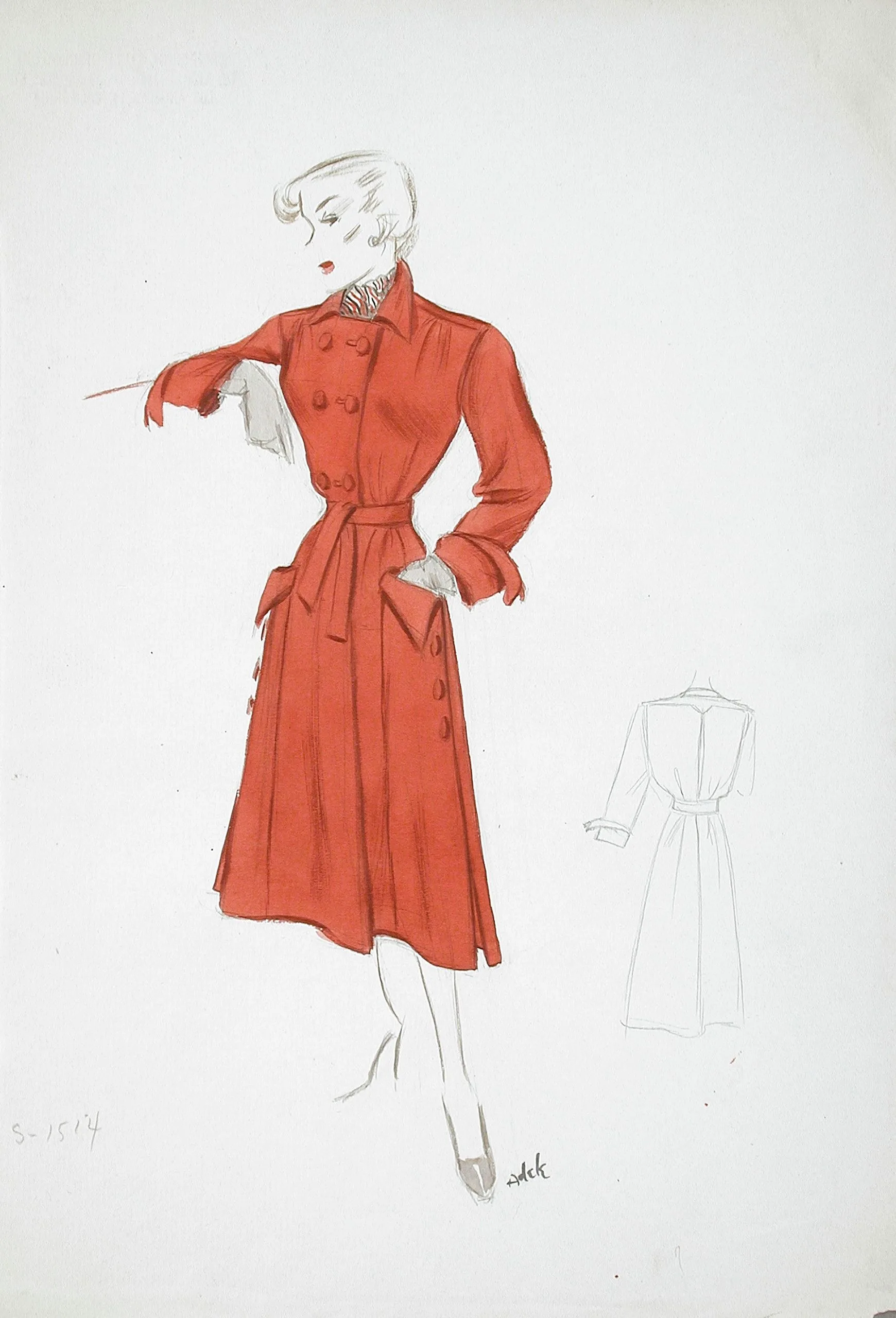 Fashion illustration in pencil and red gouache showing a woman in a double-breasted tomato-red belted coat, three-quarter back view, with a small pencil back-view sketch to the right