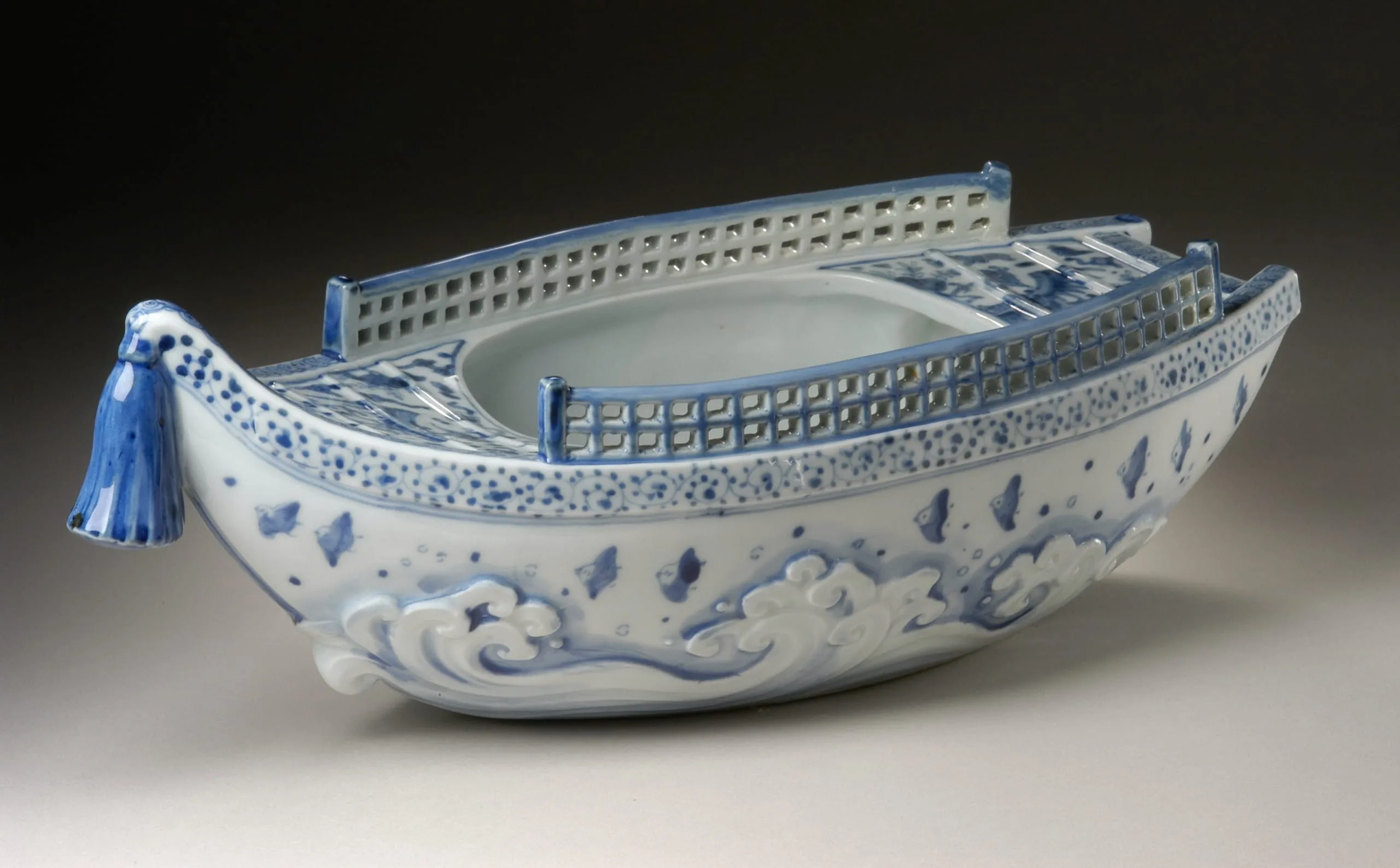 - Food Vessel in the Form of a Treasure Boat with Plovers and Waves