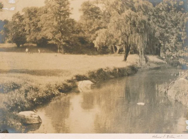 Sepia-toned photograph of a narrow, still river flanked by grassy banks and a large weeping willow, with an open meadow and tree line in the distance, signed and dated 1915