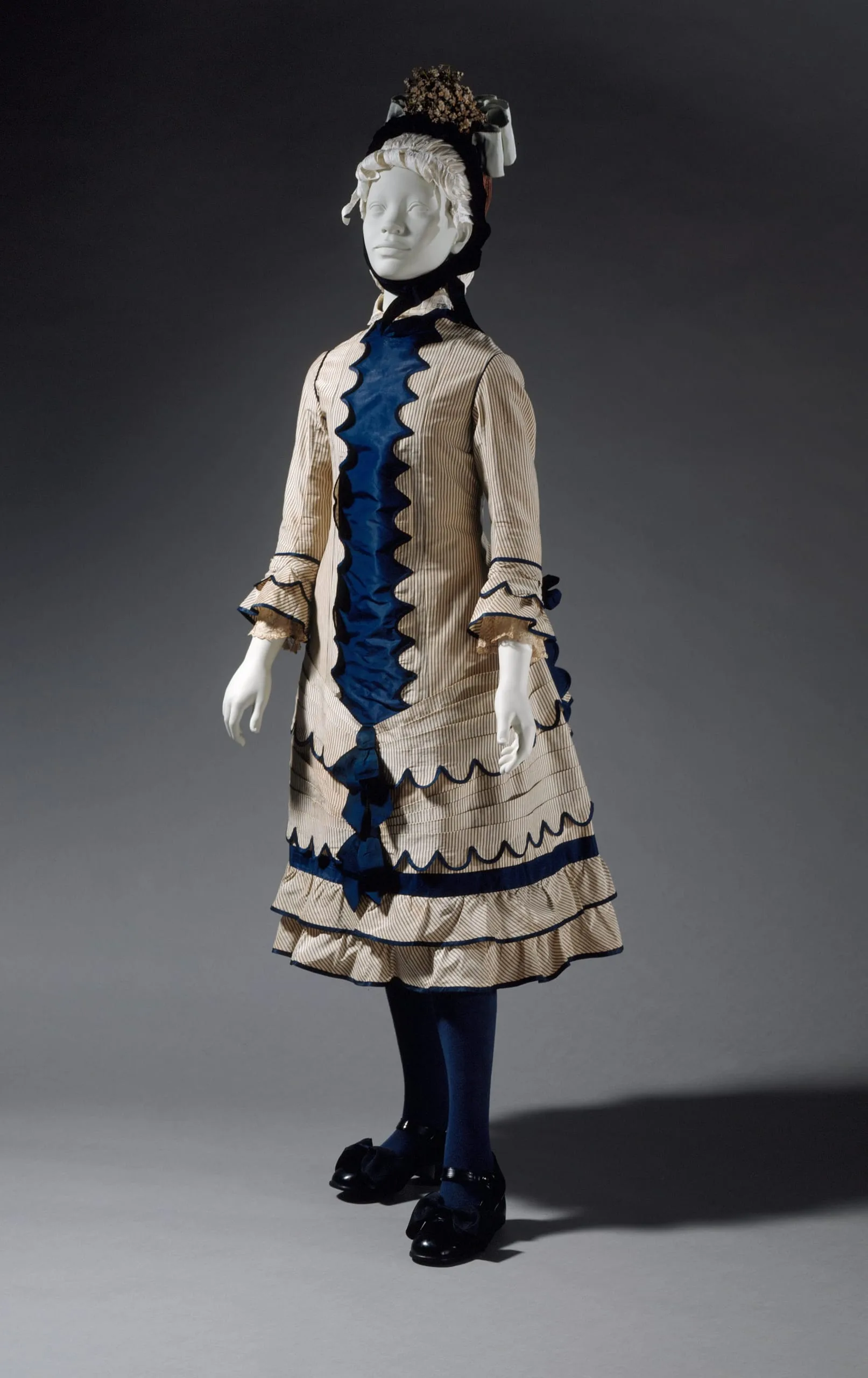 - Silk plian weave (faille) and silk plain weave (taffeta) with silk lace trim and mother-of-pearl buttons