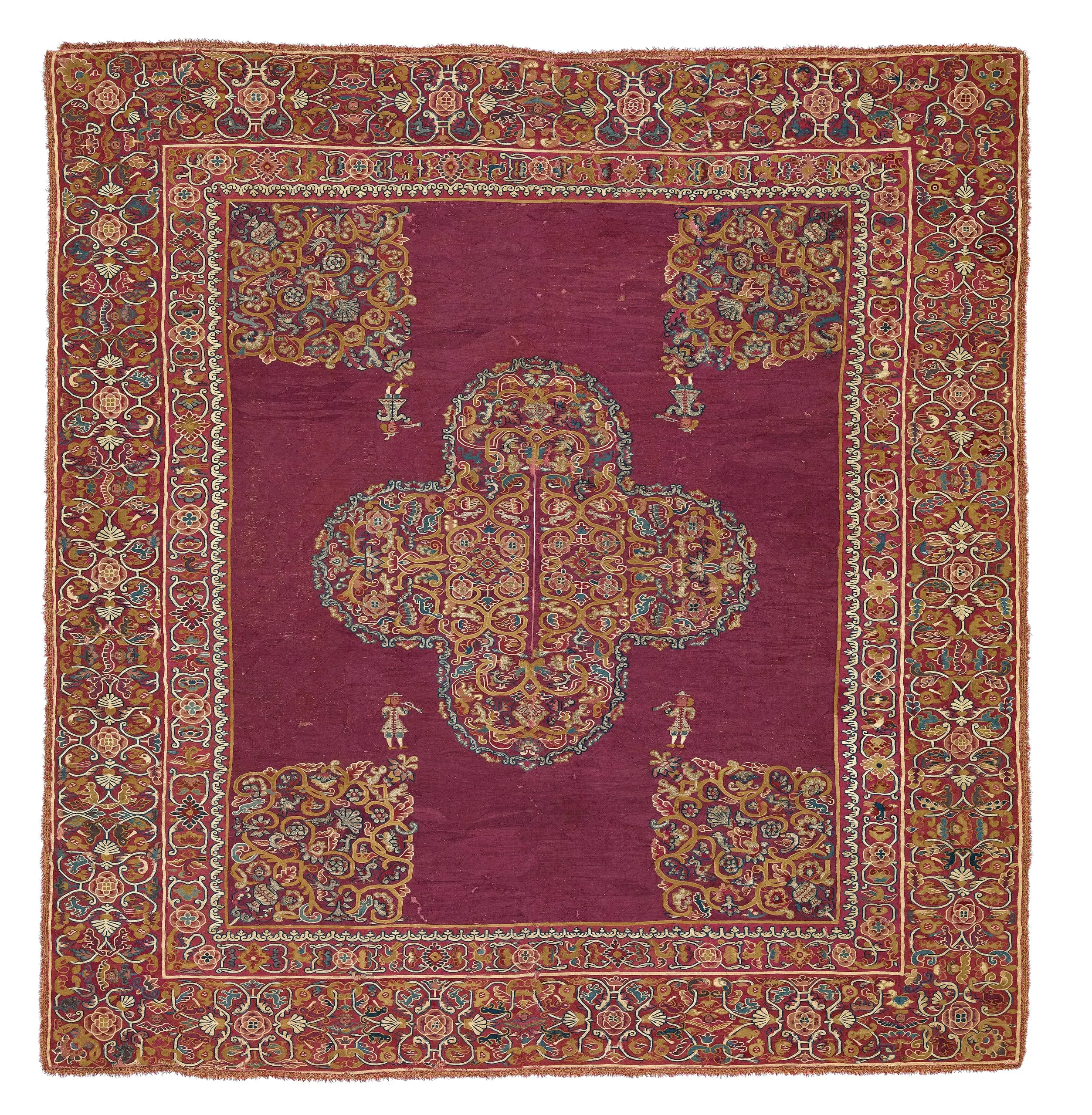 Public celebrations in Cuzco and Potosí, in present-day Peru and Bolivia, were known for their extravagance. This fine poncho would have been worn in procession by musicians, its silver threads glimmering in the sunlight. Employing traditional methods of the Inca master weavers (cumbicamayos), the poncho is filled with European-style imagery, such as cherubs, double-headed eagles, scrollwork, vines, and vases. Four musicians with trumpets—two on each side—wear fashionable Spanish dress. Tucked within these designs, birds, lions, monkeys, and other animals, including the Andean mountain viscacha (a rodent in the chinchilla family), provide ample evidence of Andean life.