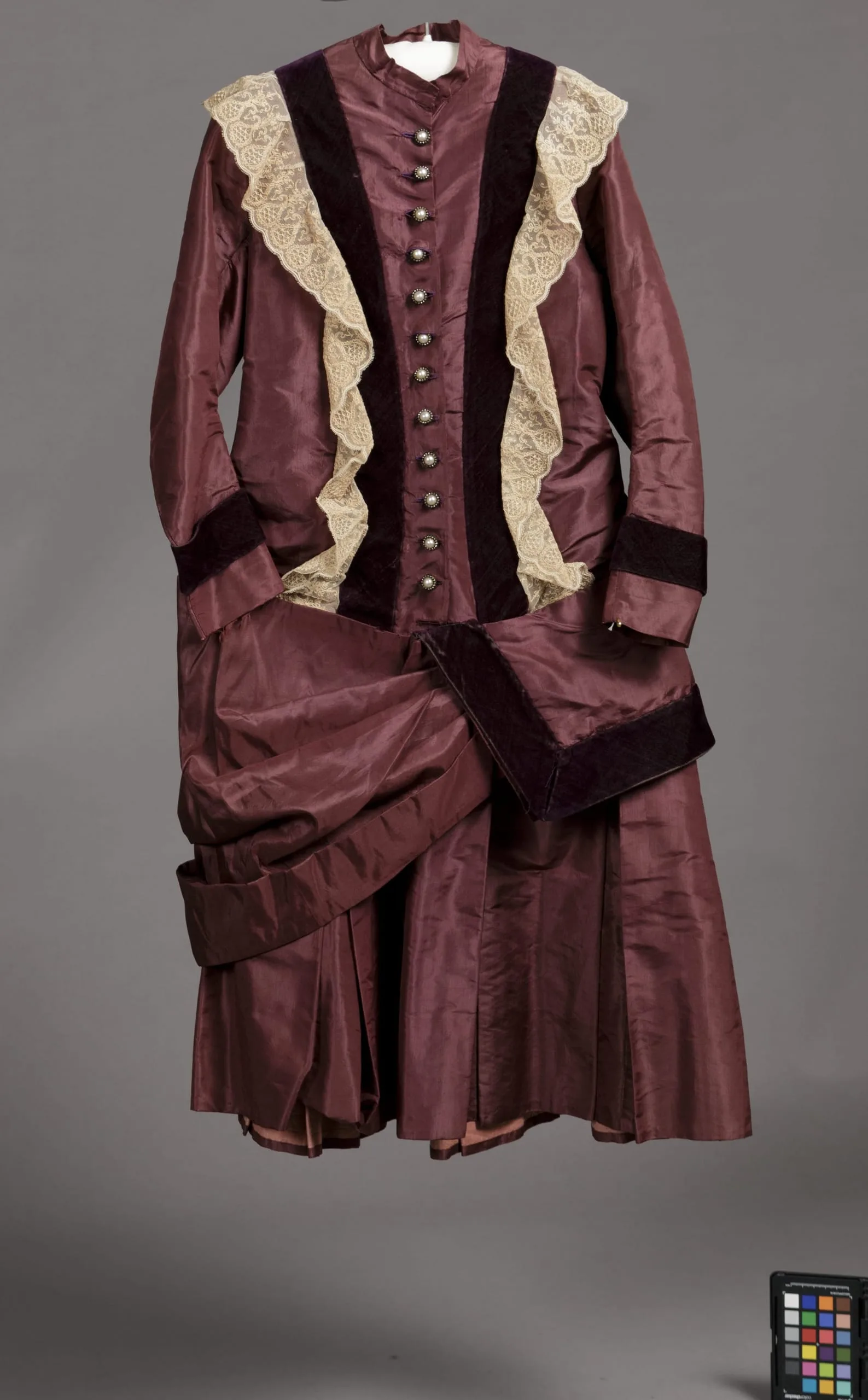 - Silk plain weave (taffeta) with silk lace, silk velvet, and metal (marcasite) and glass buttons
