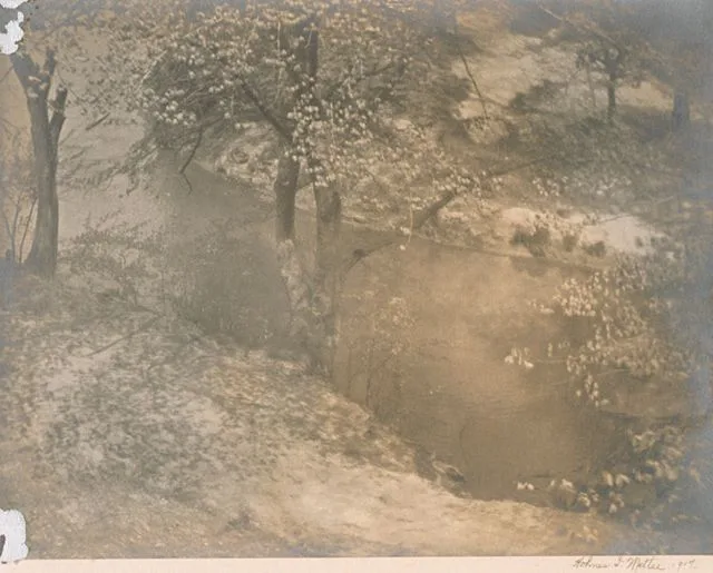 Sepia-toned photograph of a wooded pond scene with a blossoming tree in soft focus, bare earthen bank curving to still water