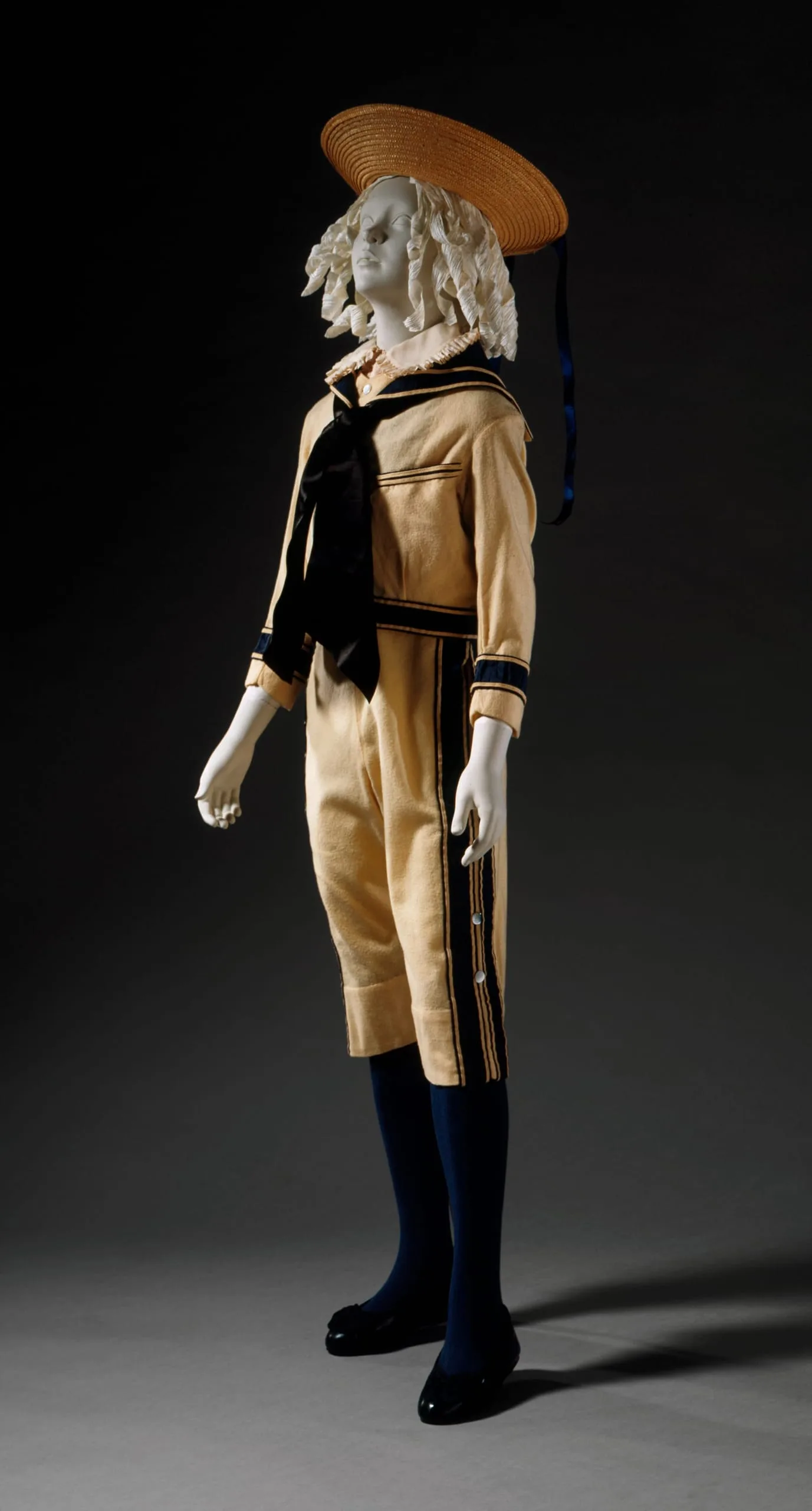 - Jacket and Trousers: wool plain weave, fulled, silk plain weave (taffeta), with wool braid trim, and mother of pearl buttons. Vest: wool plain weave, fulled, mother of pearl buttons.