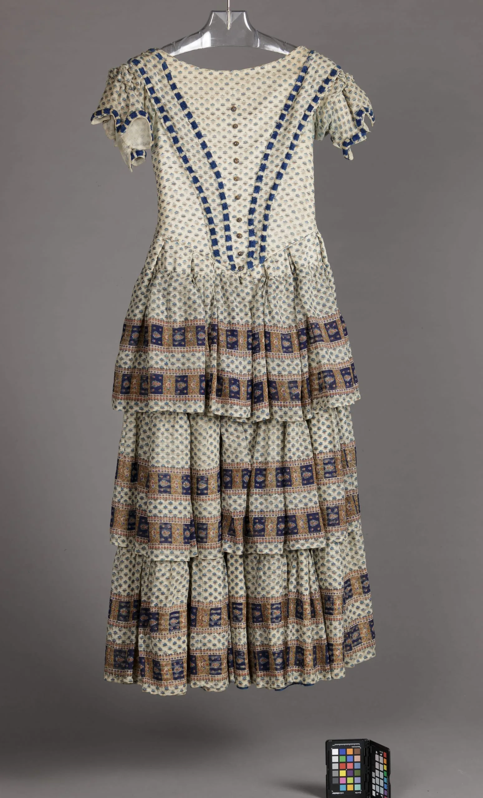 - Wool plain weave and gauze, printed, with cotton chenille passementerie and metal buttons