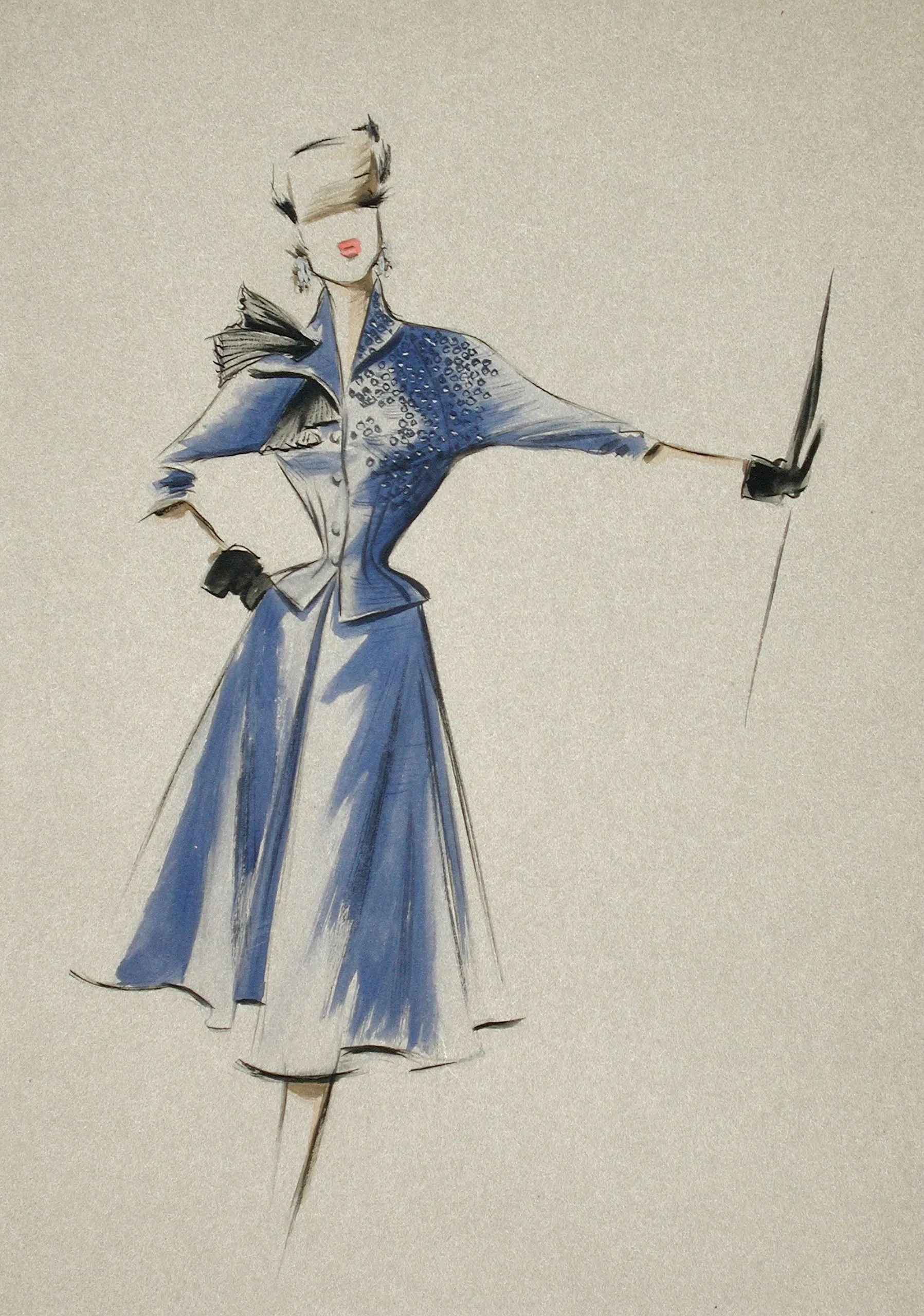 Fashion illustration in ink and gouache on gray paper, full-length figure in a cornflower-blue fitted jacket and flared skirt, holding a black umbrella, with face partially obscured by a white hat