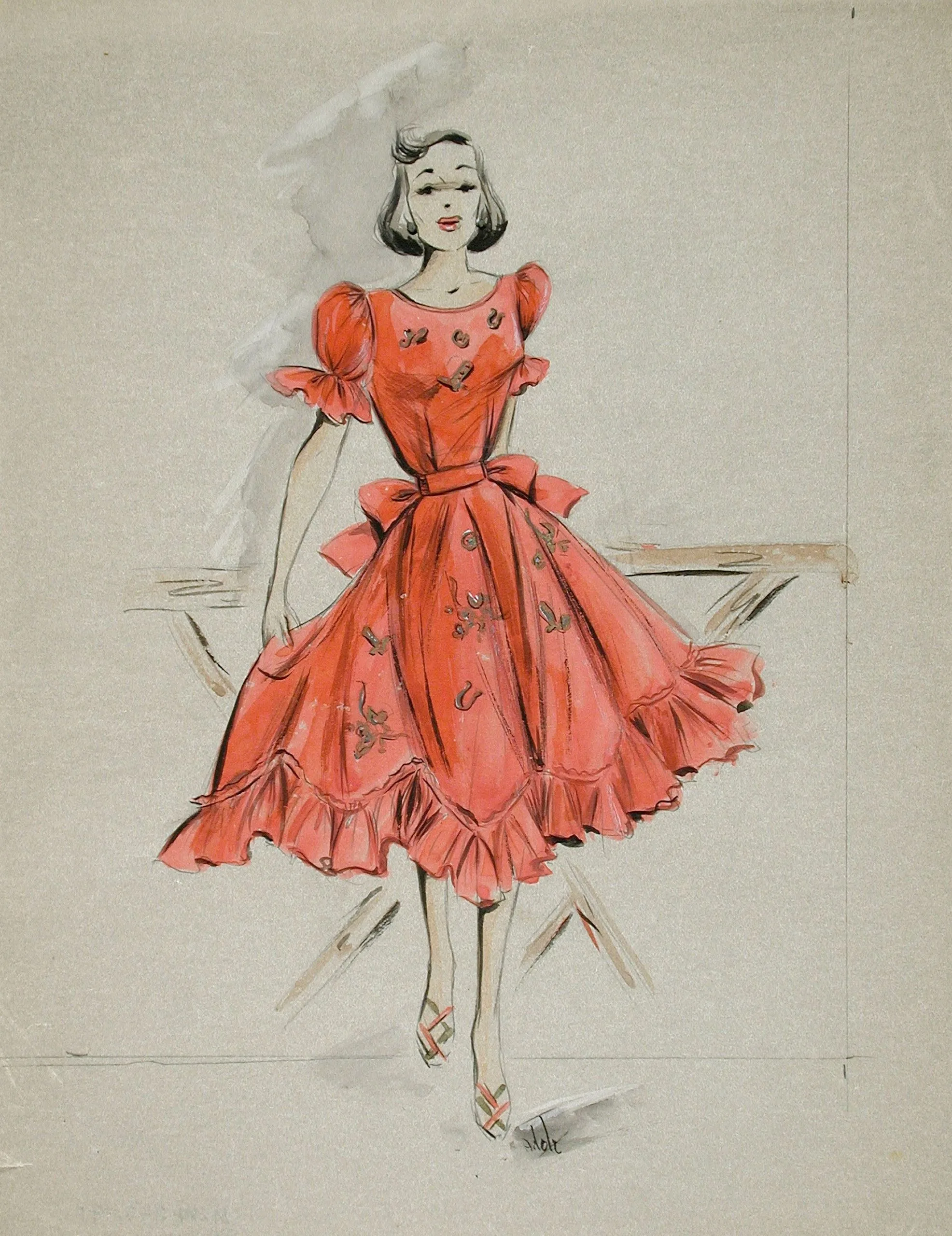 Fashion illustration in ink and watercolor on tan paper, full-length figure of a woman in a full-skirted coral-red dress with puffed sleeves, ruffle hem, and front bow