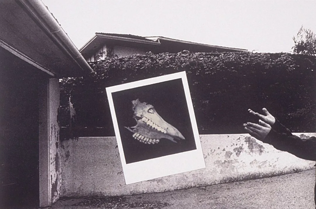 Black and white photograph of a Polaroid print showing an animal skull held up in front of a suburban driveway, with a hand visible at right