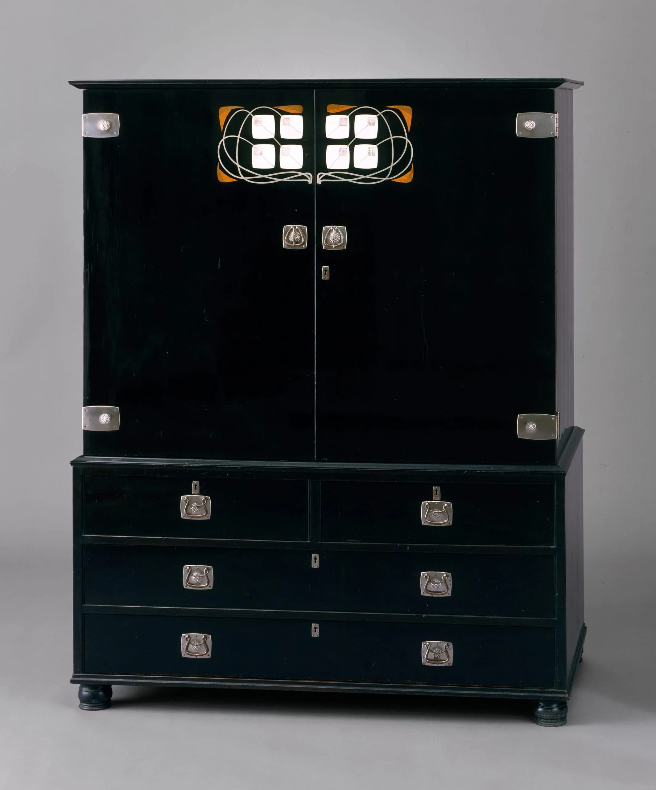 - Ebony veneer, abalone, silvered metal, paint and lacquer, inlaid ivory, mother-of-pearl, pearwood, and pewter