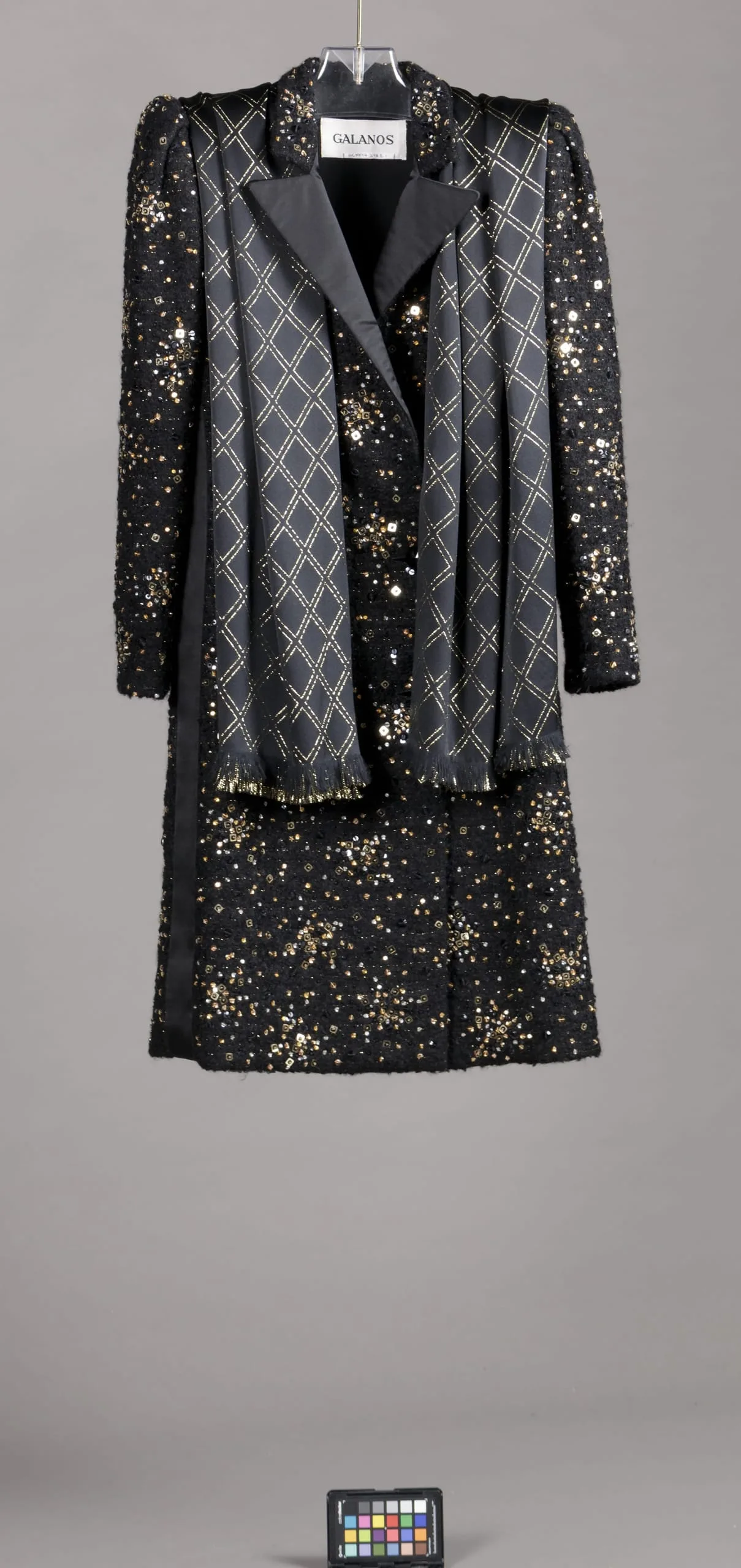 - Coat: wool and metallic thread plain weave (bouclé), silk satin with crystal and metal sequin embroidery; Scarf: silk satin with metallic thread wrap patterning