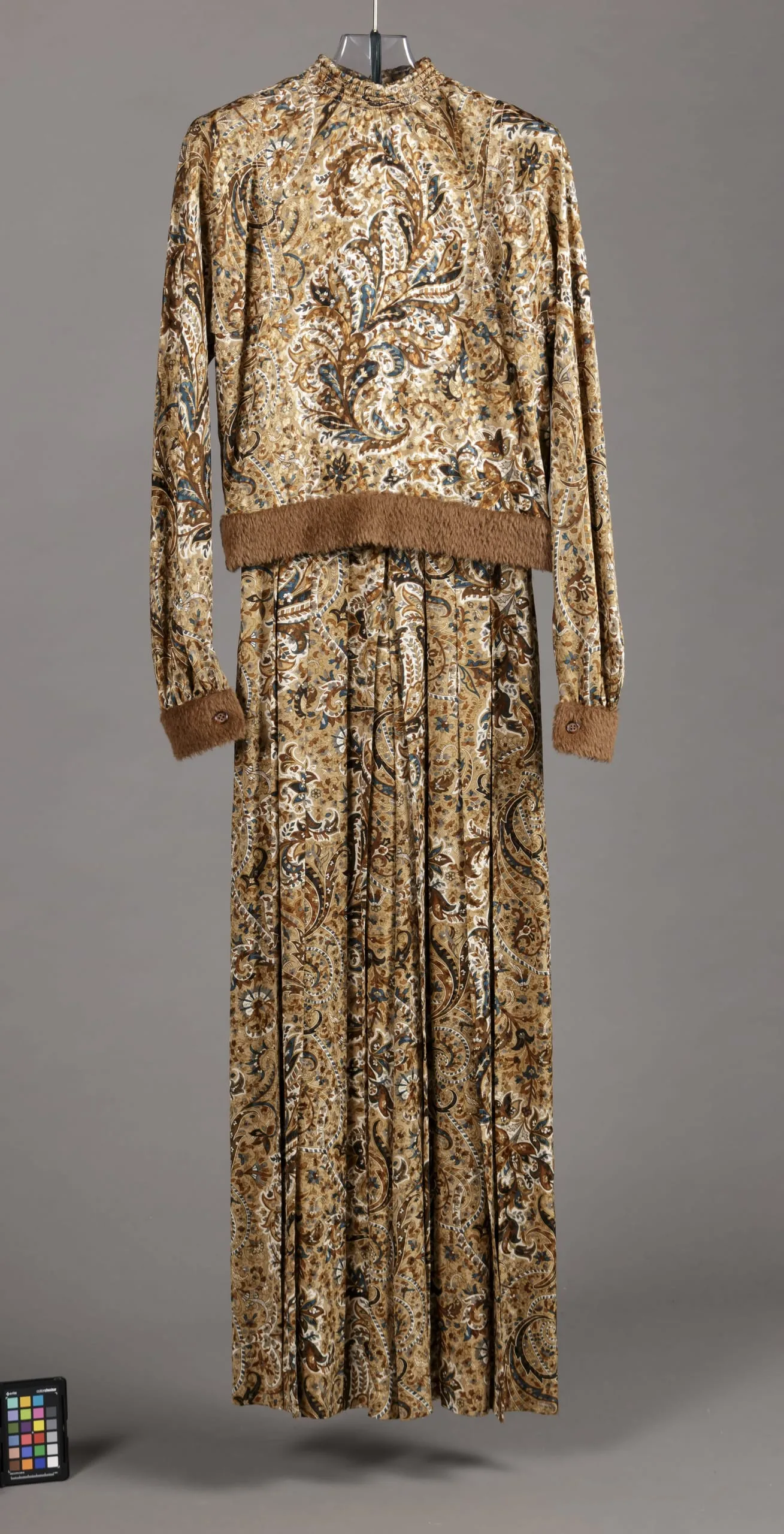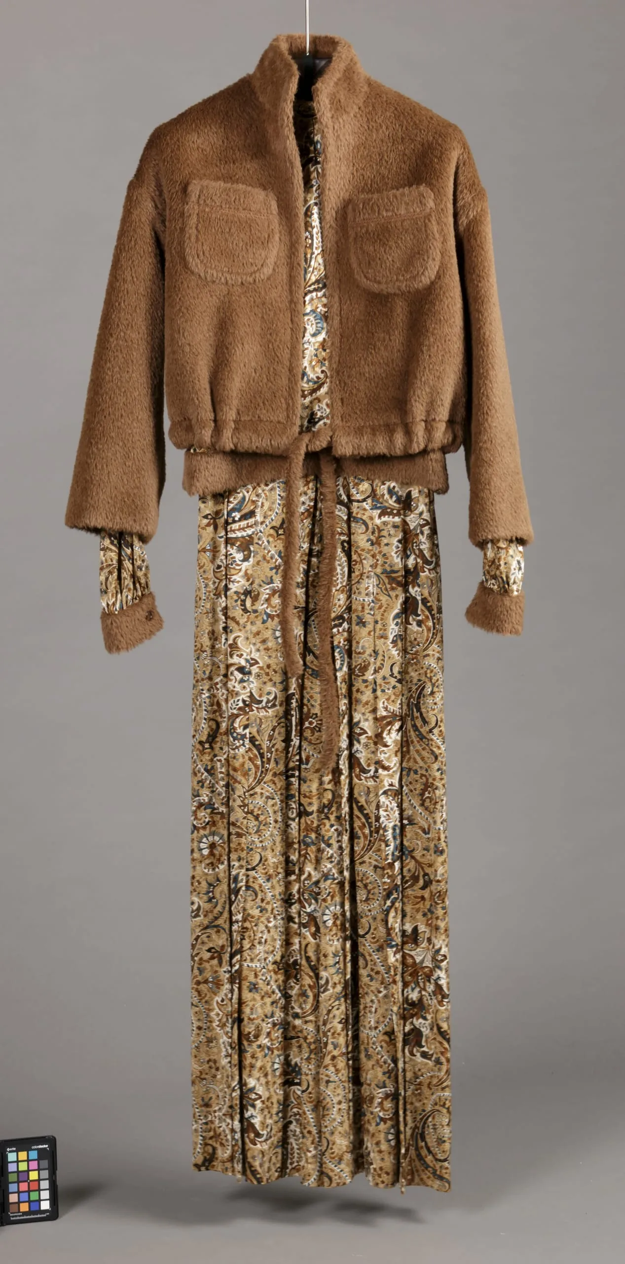 - Jacket: wool/silk plush; Blouse: silk plain weave with satin warp patterning, printed, silk/wool plush; Pants: silk plain weave with satin warp patterning, printed