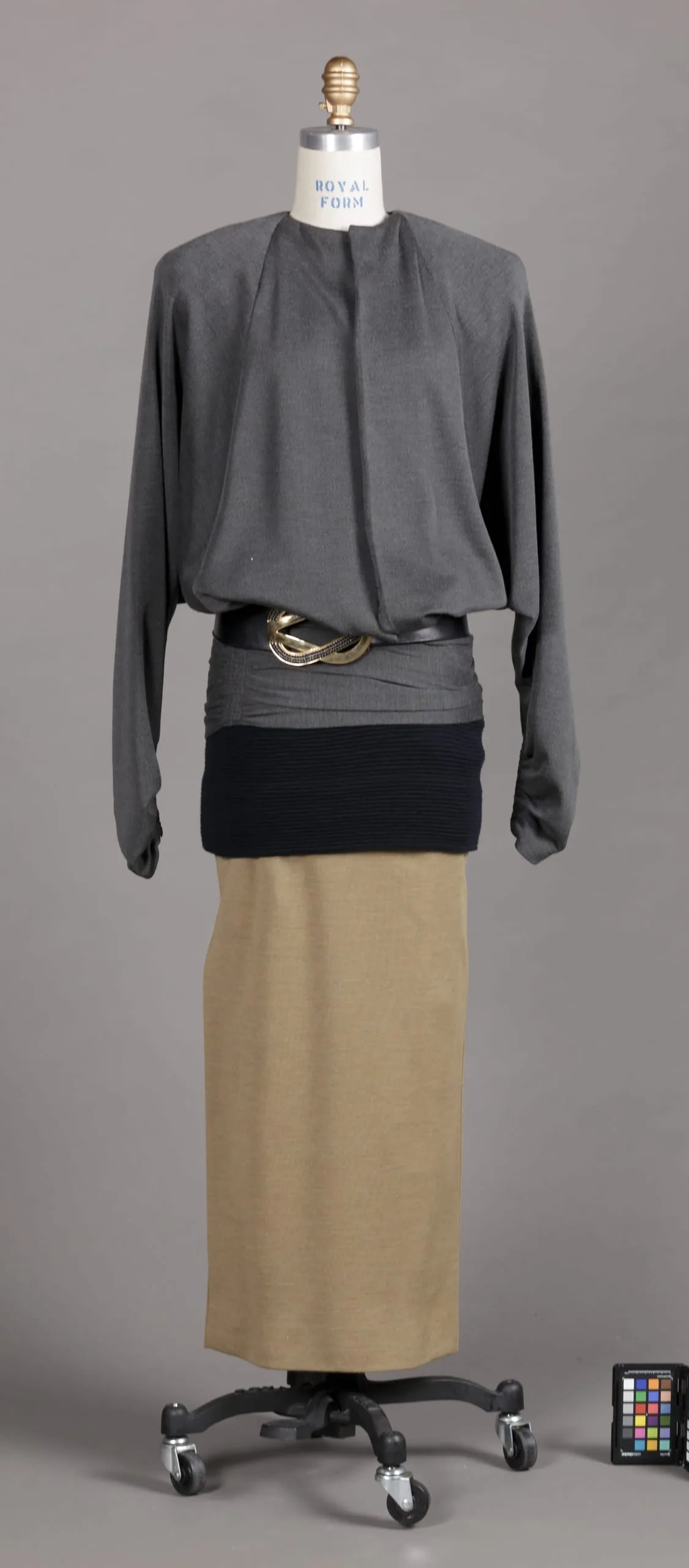 - Dress: wool knit (jersey) and wool knit, ribbed; Belt: leather with metal and crystals