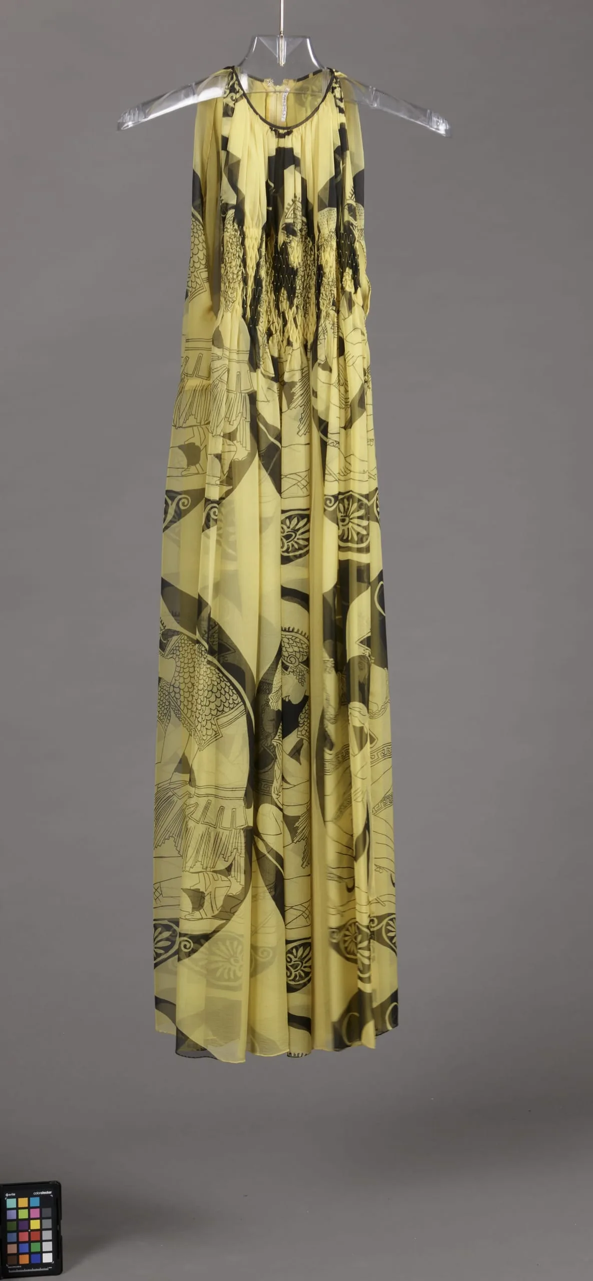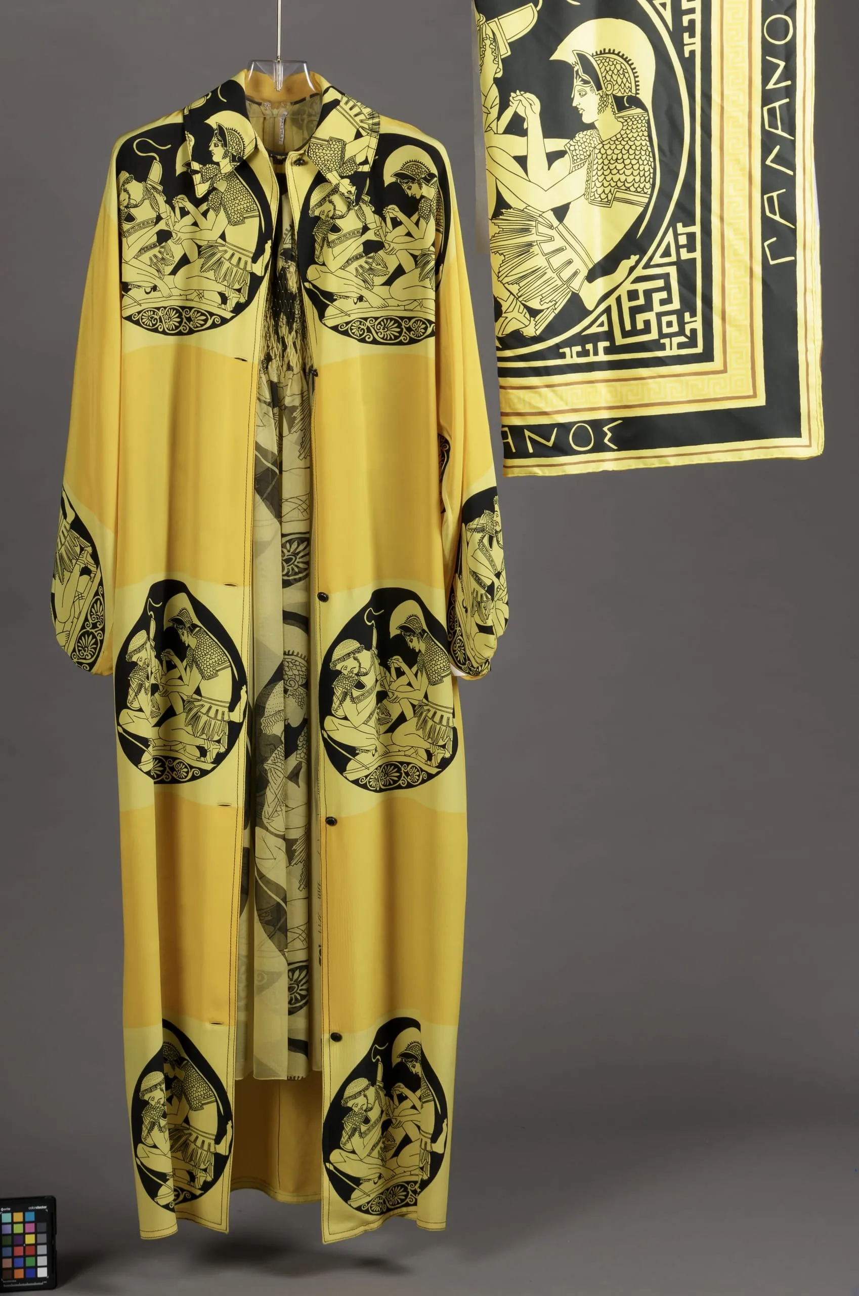 - Dress: silk plain weave (crepe chiffon), printed; Coat: silk plain weave (crepe), printed; Scarf: silk twill, printed