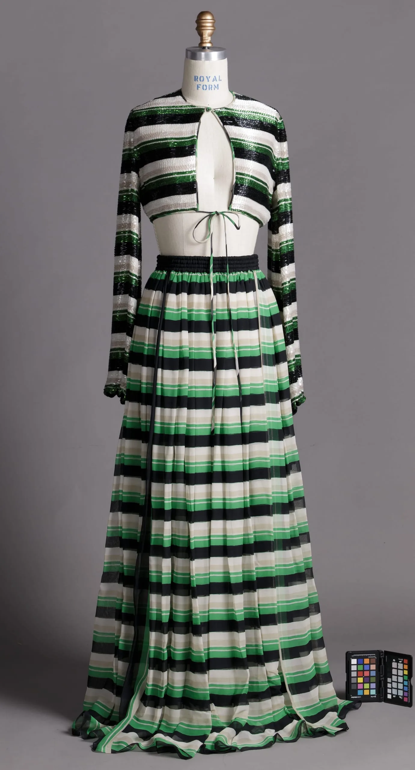 - Blouse: silk plain weave (chiffon) with glass beads; Skirt: silk plain weave (chiffon)