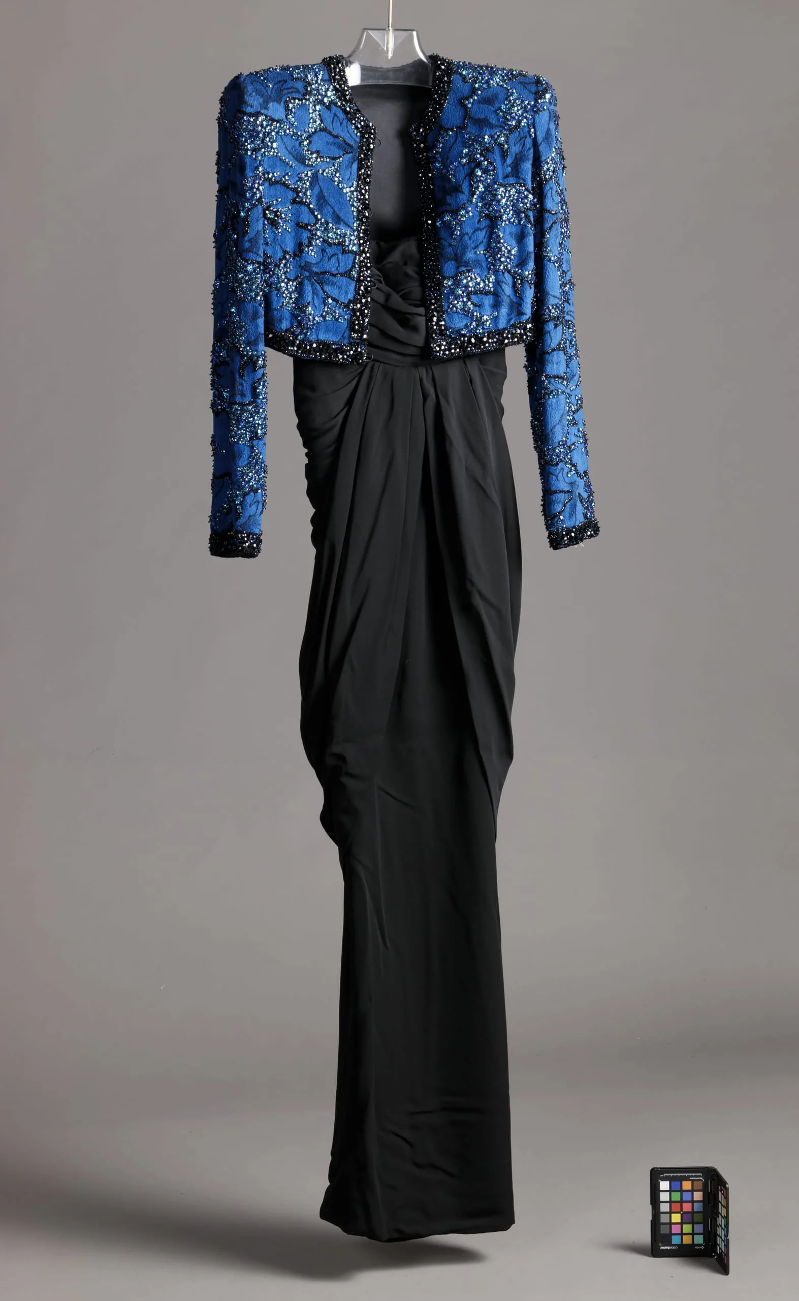- Dress: silk plain weave (crepe); Jacket: silk cut and voided velvet, printed, with crystals and glass beads