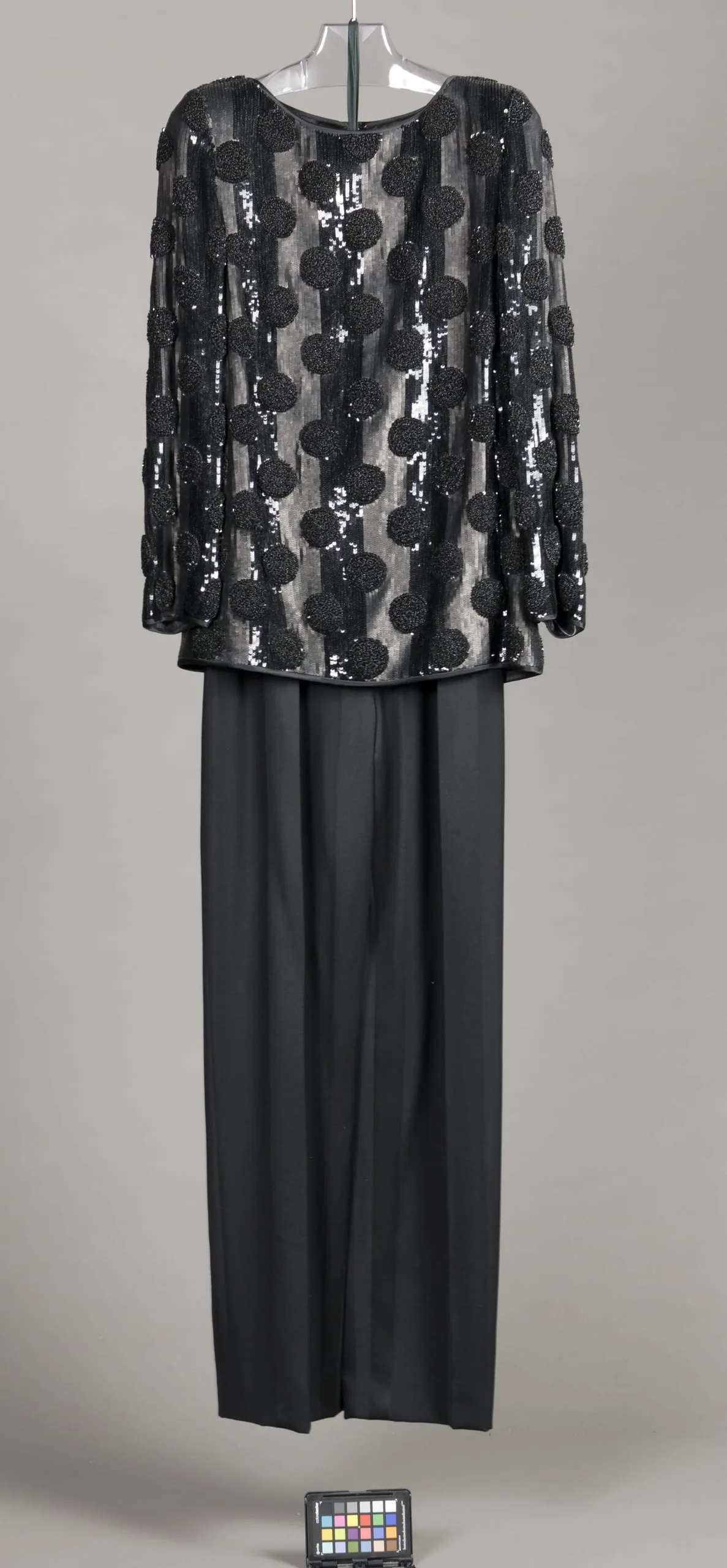 - Blouse: Plastic sequins and glass beads with silk satin; Pants: Wool, plain and twill weave.