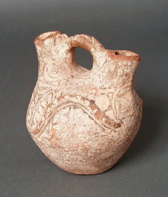 Small terracotta ceramic vessel with globular body, arched loop handle, narrow spout, and painted curvilinear decoration in brick-red on a worn pale slip