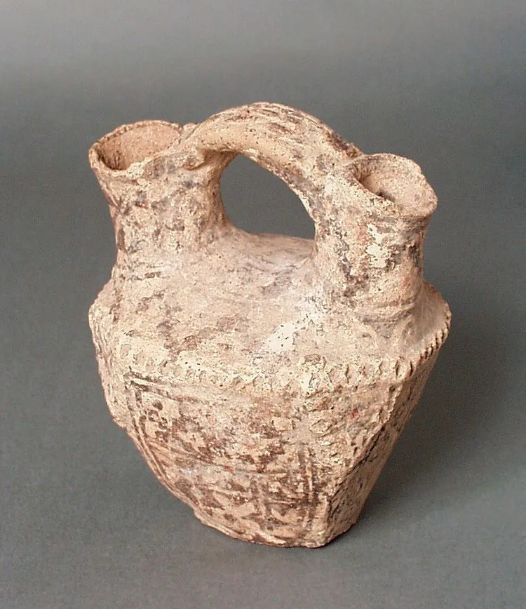 Small unglazed terracotta vessel with two short spouts connected by an arching handle, covered in incised crosshatched surface texture