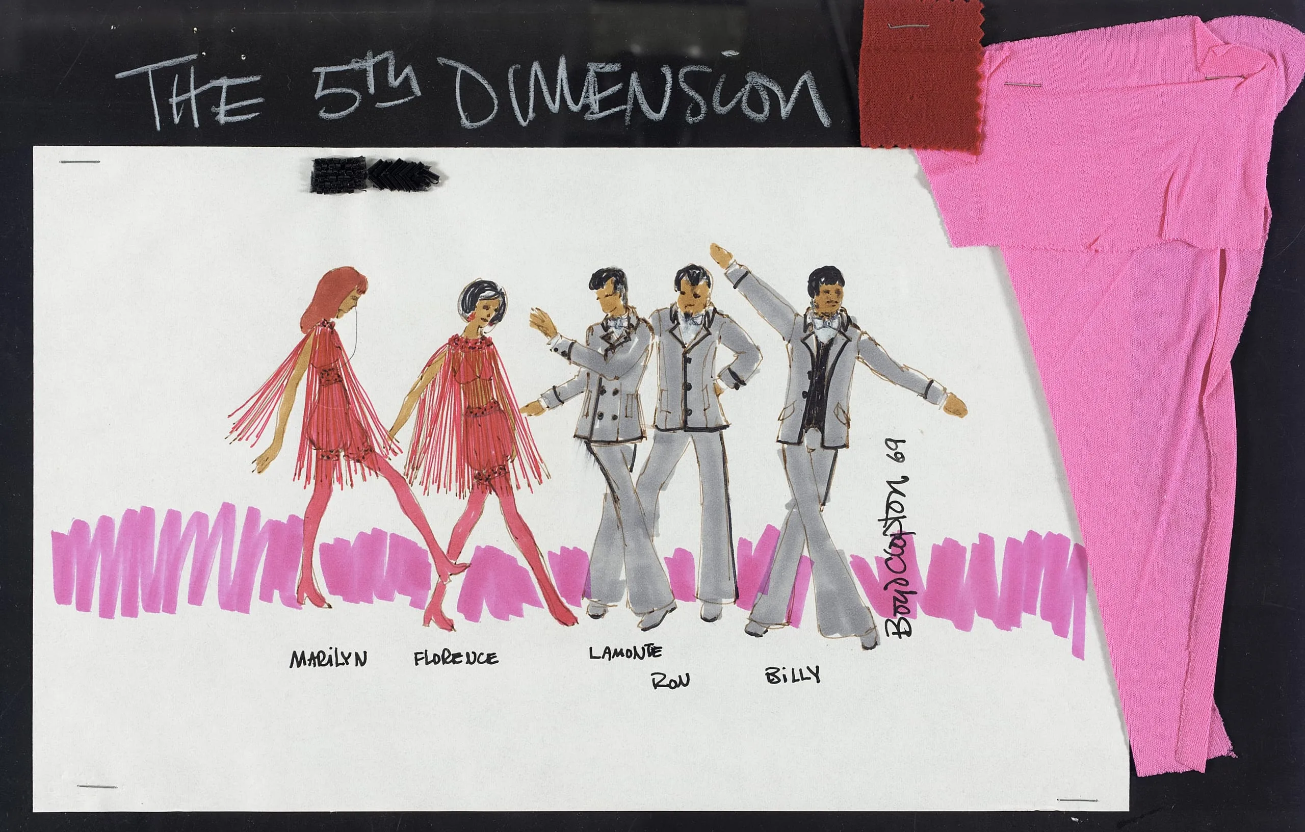 Costume design drawing in marker and ink showing five figures in coordinated stage outfits, two women in pink fringed dresses and three men in gray suits, labeled with names; fabric swatches attached to mount