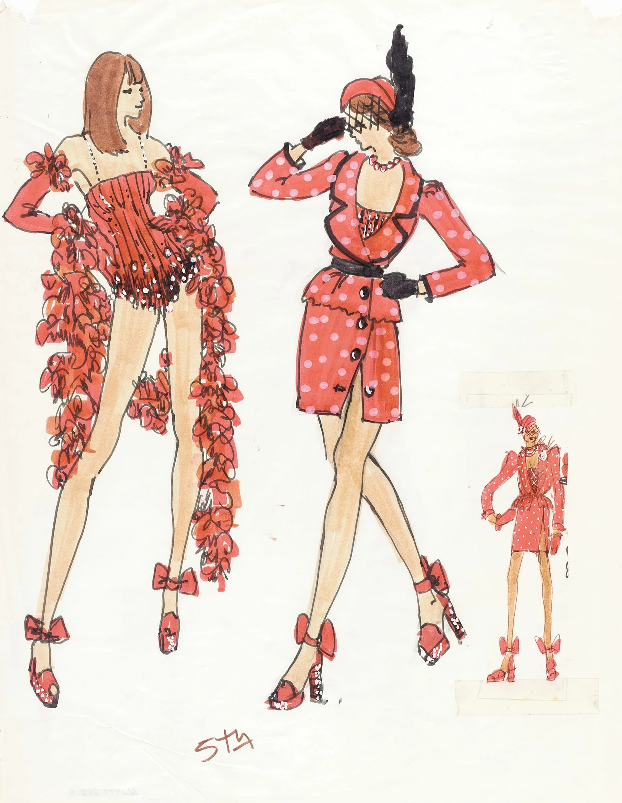 Costume design drawing in ink and watercolor showing two elongated fashion figures in coral red outfits with bow-detailed heels, plus a small reference sketch