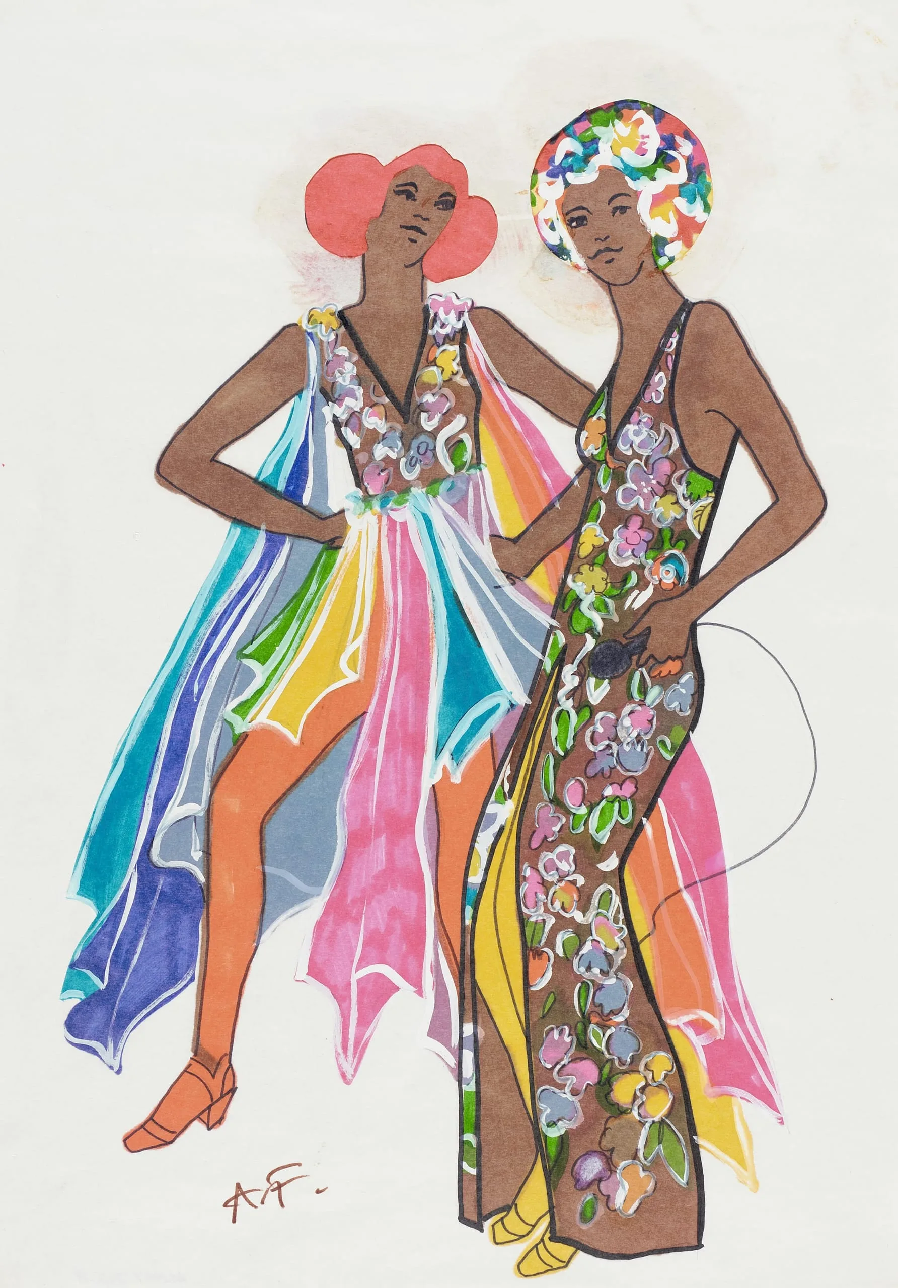 Fashion illustration in ink and watercolor, two stylized figures with brown skin wearing floral and rainbow-paneled gowns, both with large, colorful afro hairstyles