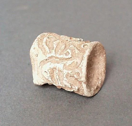 Small rectangular clay or plaster object with a hollow interior and relief-carved scrolling organic motifs on the front face, pinkish-tan in color with pale raised decoration