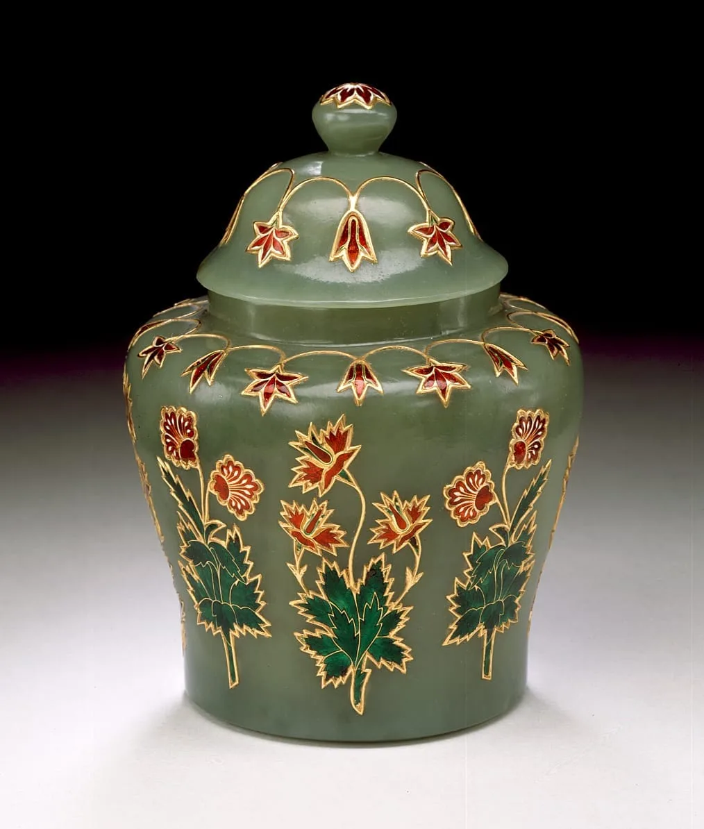 Deriving from the Mughal tradition of covered jade jars, such as a late 17th-century example in the British Museum, London (1945,1017.258.a-b), this mid-20th-century vessel recalls the rarer form of jade baluster vases, such as a bejeweled specimen attributed to 19th-century Lucknow in the Victoria and Albert Museum, London (688-1874). More exact morphological models may have been the Chinese vessels known as Temple Jars and Ginger Jars, such as a 19th-century Jingdezhen porcelain jar in the Asian Art Museum (B60P339.a-.b). The use of enameling as the surface ornamentation rather than the more common inlaid gemstones also evokes certain 18th-century Mughal vessels, such as an ewer in the Victoria and Albert Museum (IS.02594&A). Ultimately, the LACMA jar likely epitomizes the contemporaneous Mughal-style vessels produced in Jaipur, such as an enameled gold bottle in the British Museum (2001,0521.23).