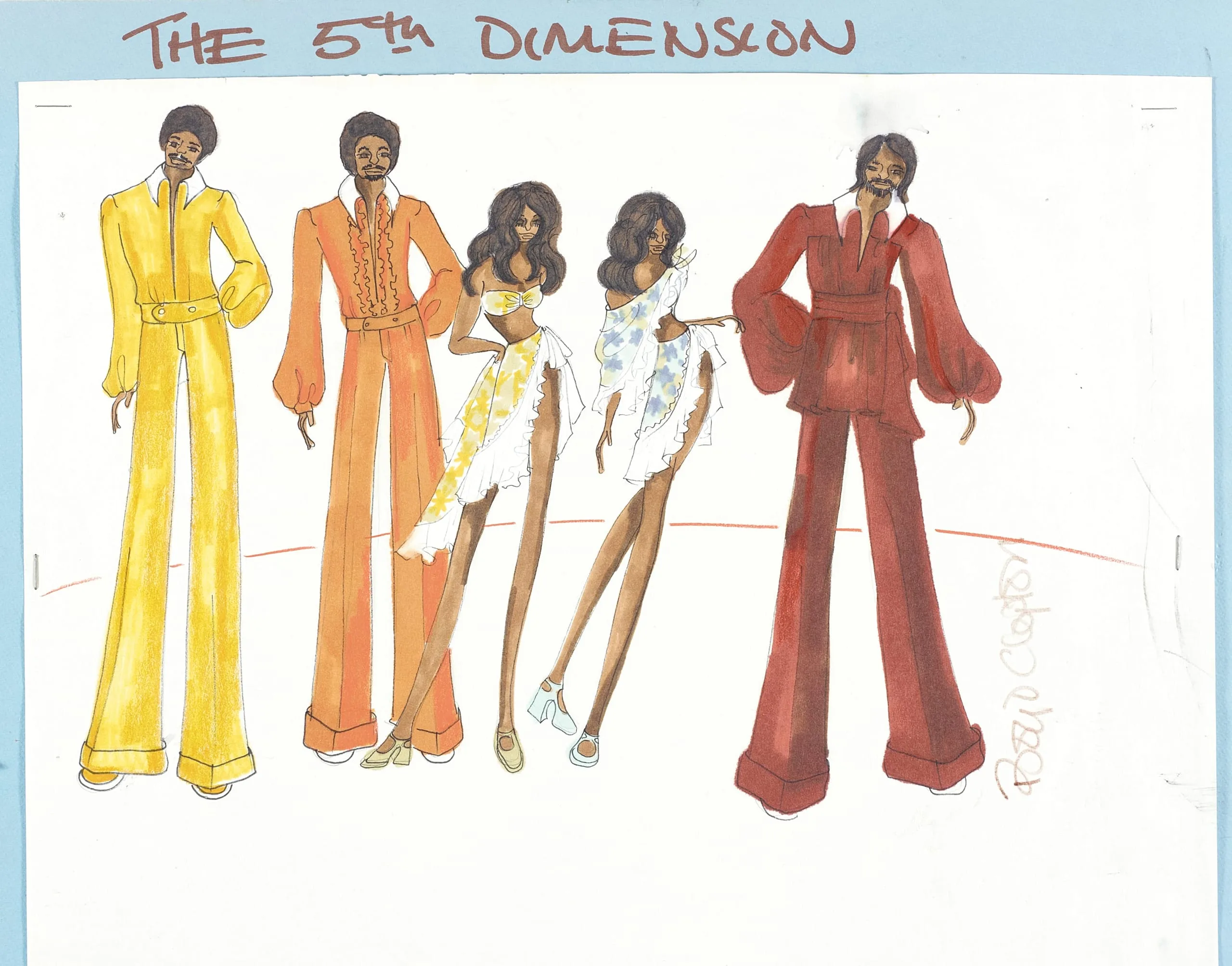Costume design drawing in marker and watercolor showing five elongated fashion figures in 1970s-style stage outfits in yellow, orange, white, and red, with 'THE 5th DIMENSION' lettered across the top