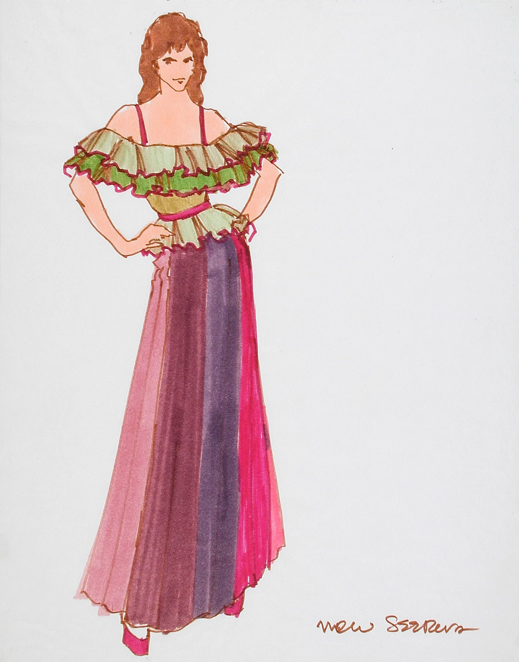 Fashion illustration in ink and watercolor of a woman shown from behind in a ruffled off-the-shoulder green and magenta gown with a multicolored vertical-panel skirt