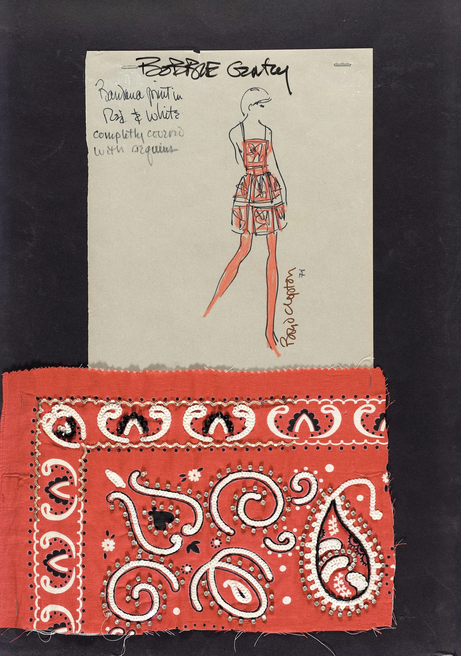 Fashion design sketch in ink and red marker on cream paper, showing a figure in a short bandana-print dress, mounted above a red paisley fabric swatch embellished with sequins