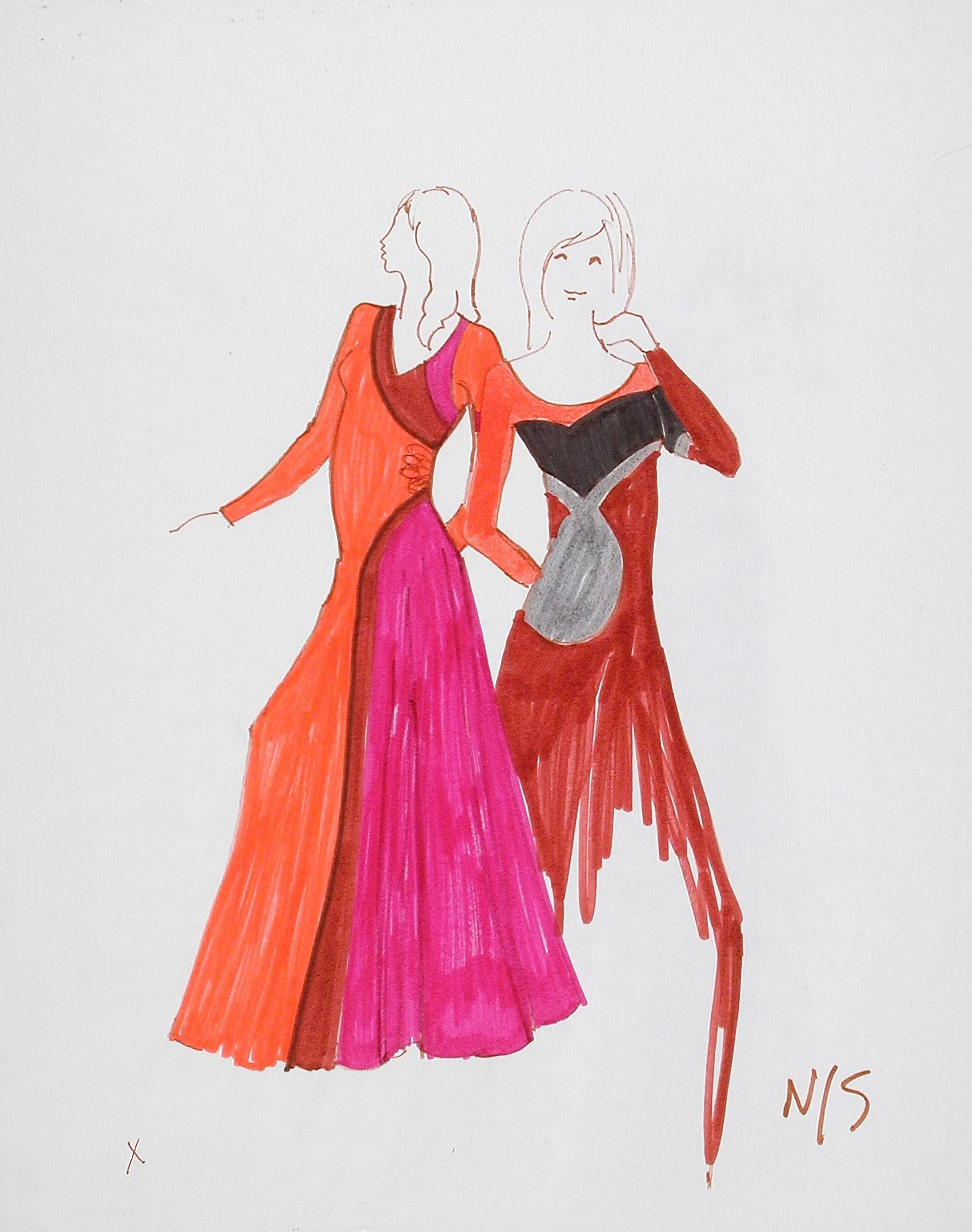 Fashion illustration in marker and red ink on white paper, two elongated female figures in long red gowns with magenta and black accents, loose gestural style
