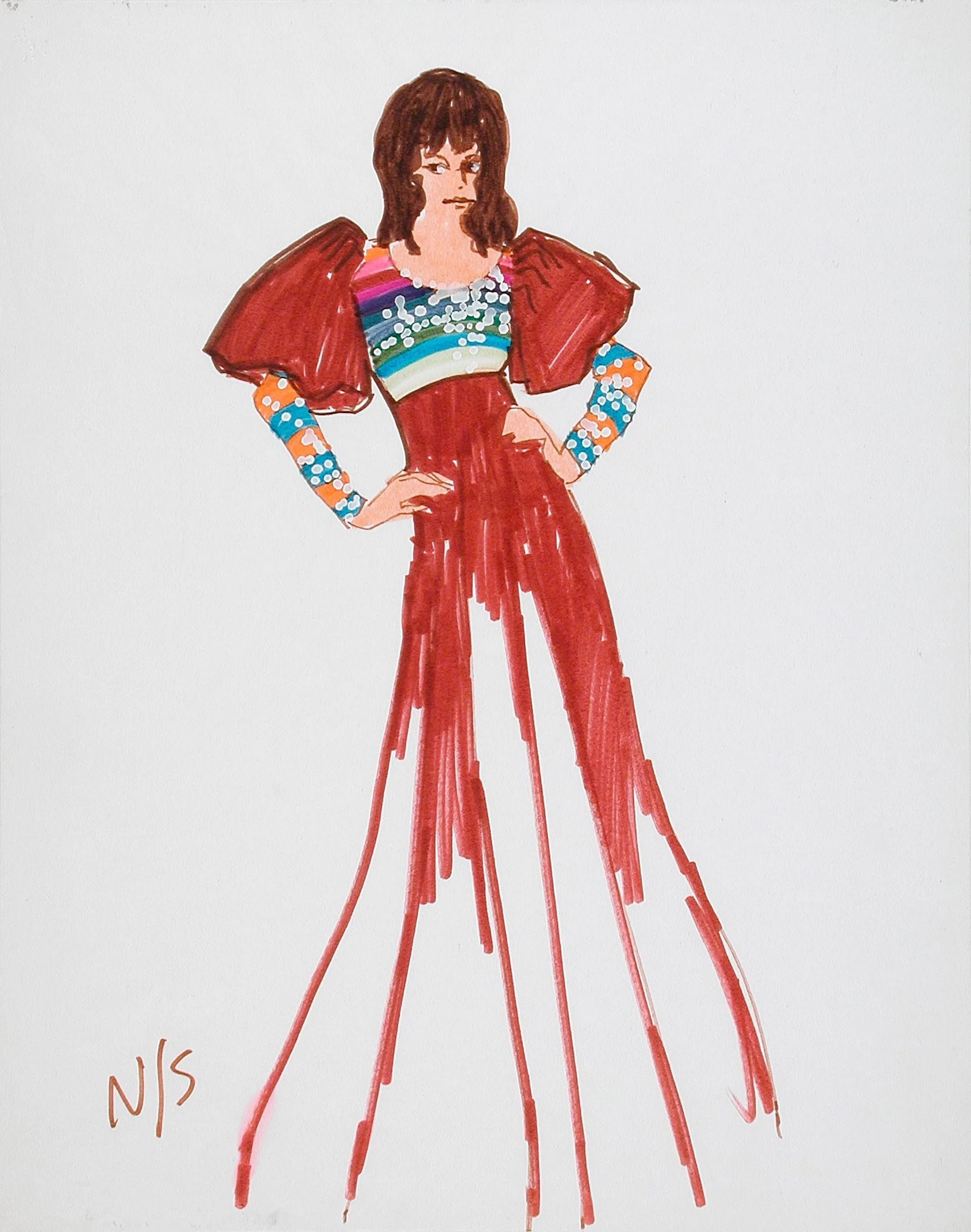 Fashion illustration in marker on white paper, full-length figure in a crimson gown with puffed sleeves, multicolored striped bodice, and loose vertical strokes suggesting a wide skirt