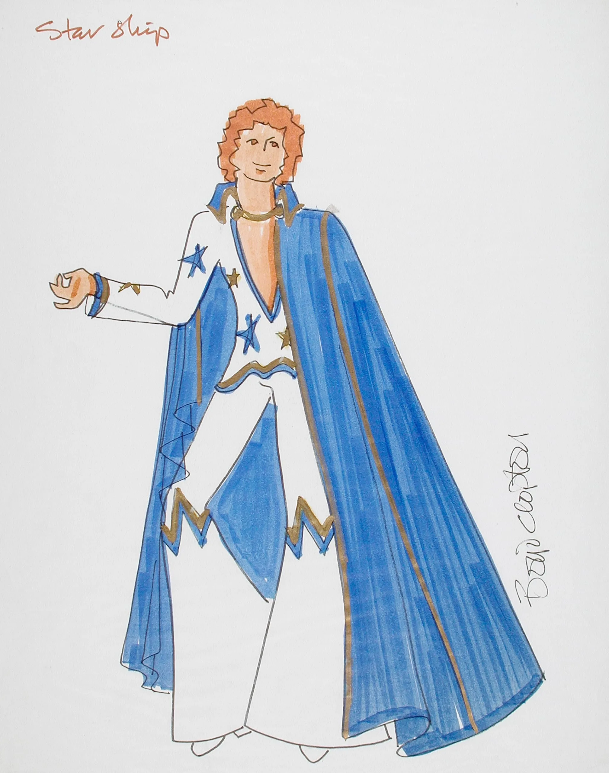 Ink and watercolor costume design drawing of a standing figure in a white star-printed jumpsuit with cobalt blue cape and gold trim, on white paper