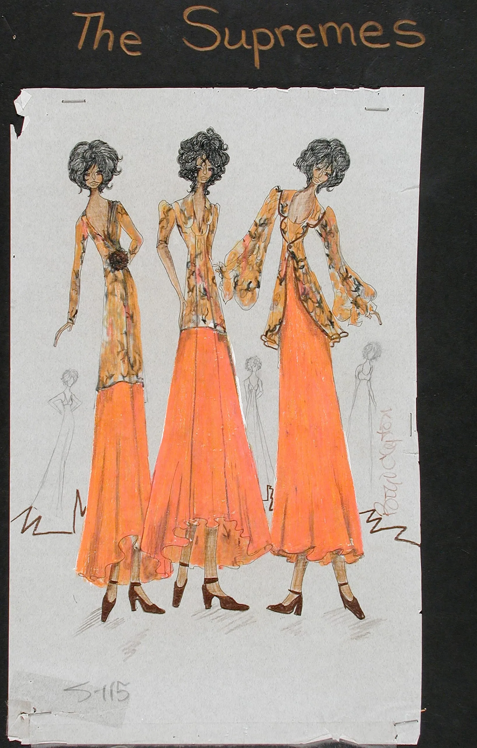 Fashion illustration in marker and gouache on gray paper showing three female figures in matching floral orange tops and coral floor-length skirts, labeled 'The Supremes' in copper lettering above