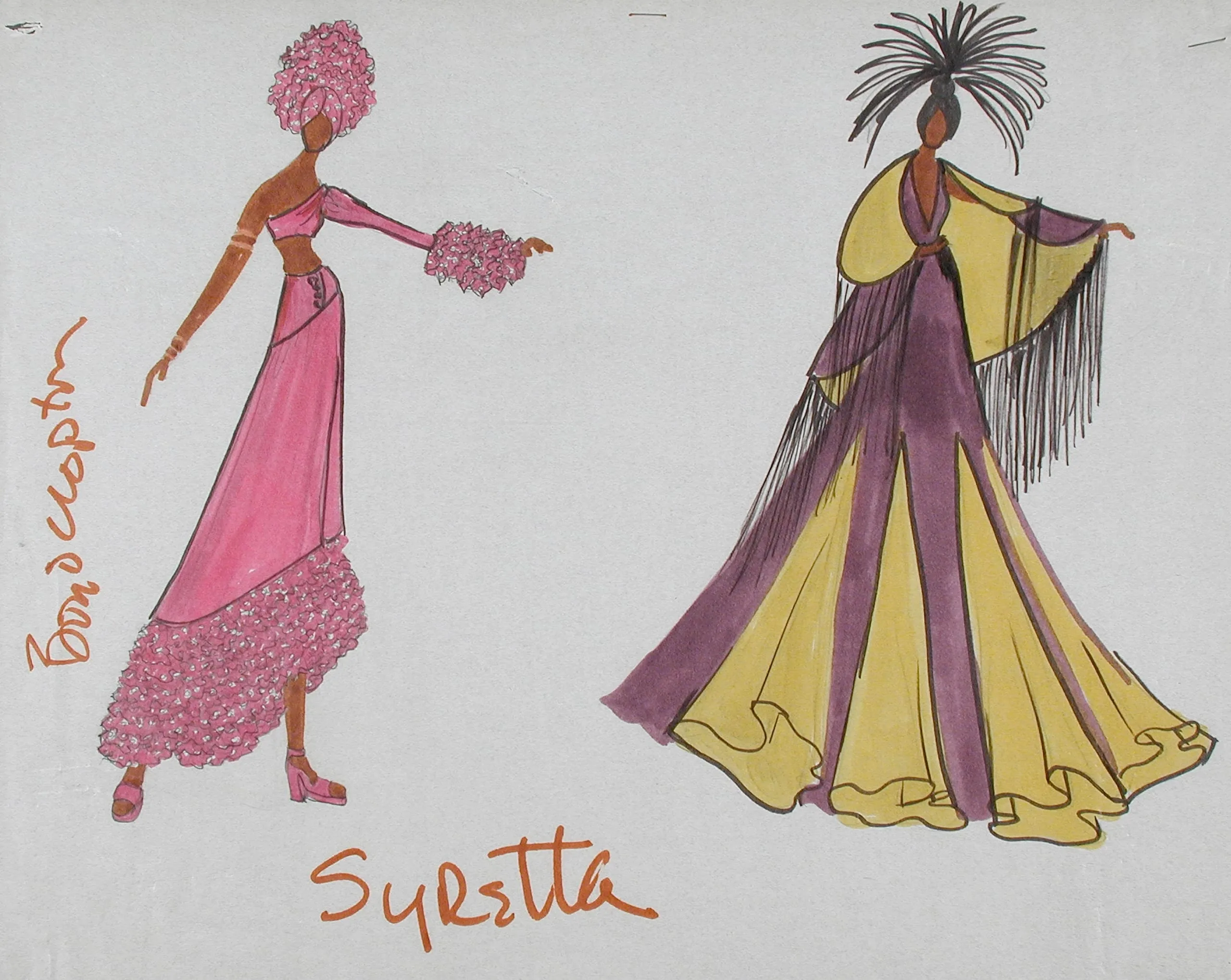 Ink and watercolor costume design drawing showing two elongated fashion figures: one in a pink ruffled gown with a floral headpiece, one in a yellow and purple fringed cape with a feathered headdress