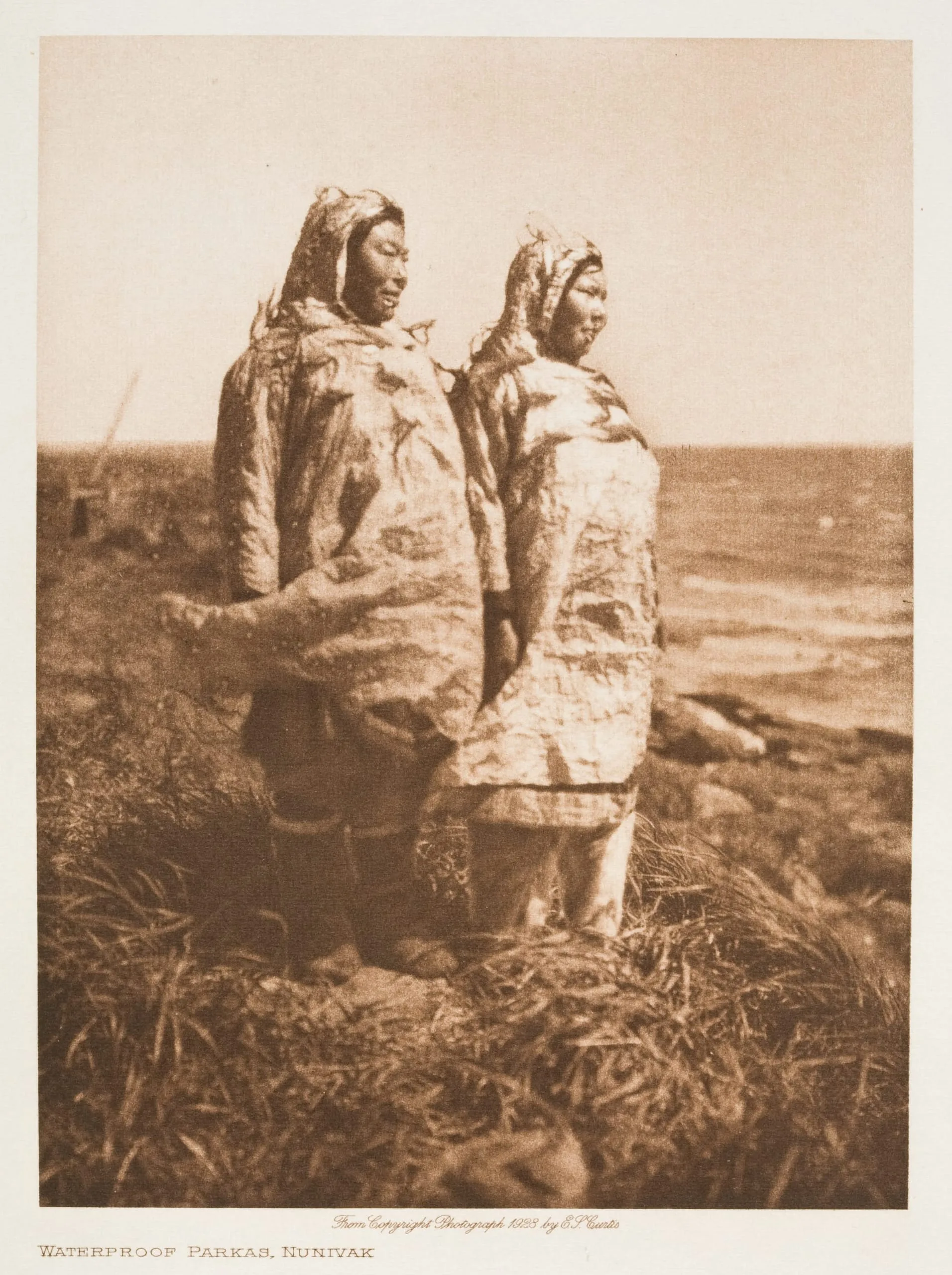 Sepia-toned photogravure print of two figures in hooded waterproof gut-skin parkas standing on a grassy shoreline, facing right in three-quarter profile