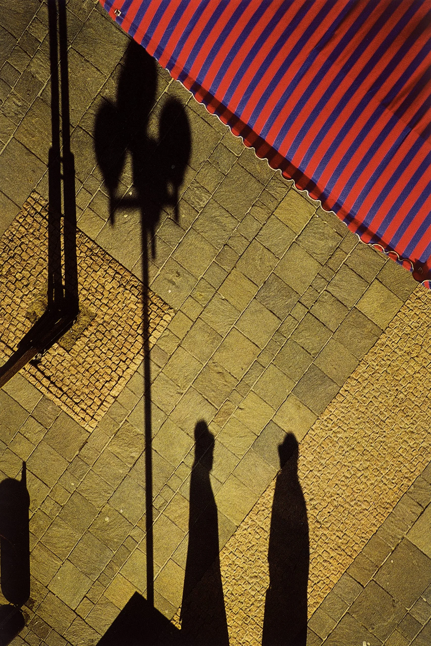 Color photograph looking down onto amber cobblestones, with long shadows of two people and a street lamp stretching across the ground beneath a red and blue striped awning
