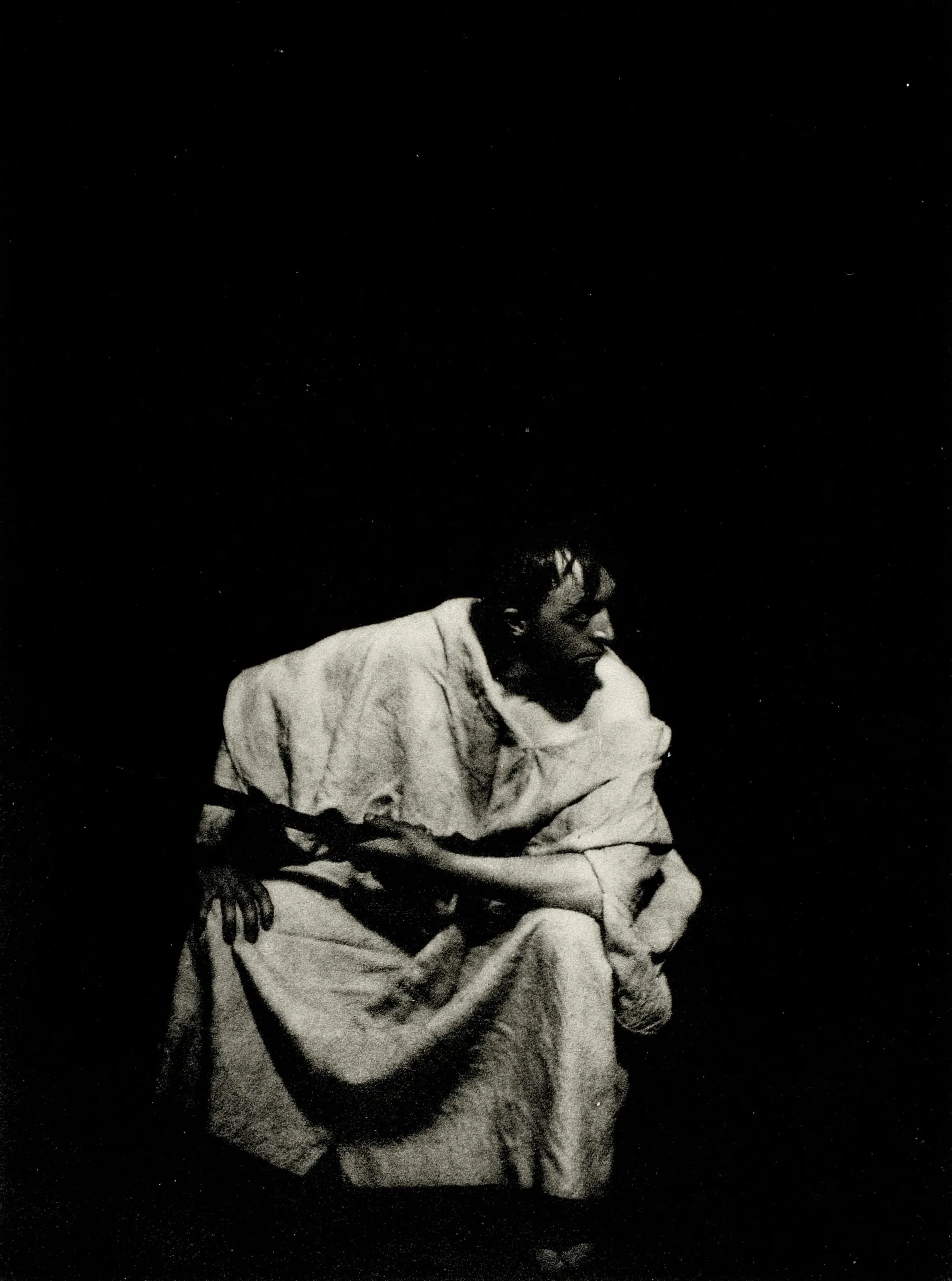 High-contrast black and white photograph of a figure in a loose white garment, crouched with knees drawn up and head bowed, against a deep black background