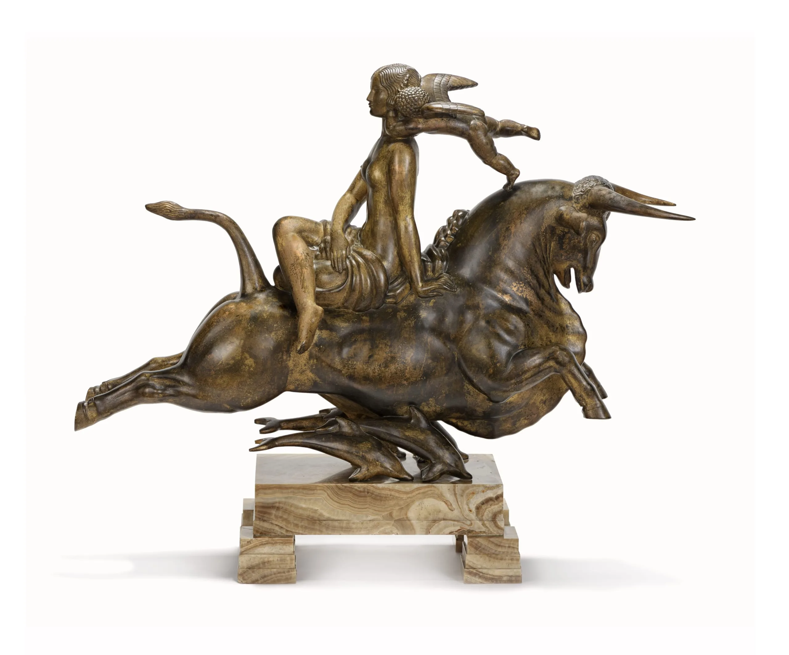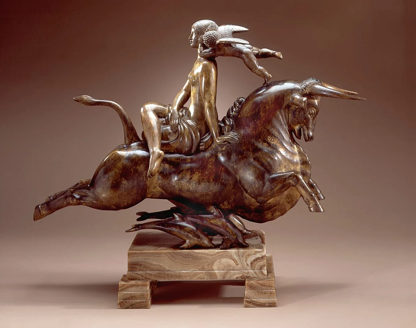 The sculpture’s delicately gilded surface and original beige-and-white onyx base not only demonstrate Manship’s love of expensive materials and rich surfaces: above all, they illustrate his exquisite sense of taste. Nothing was overdone. The decorative linear detailing, which became Manship’s hallmark, is limited to small areas: Europa’s coiffure, Cupid’s wings and hair, and the bull’s mane. Even his approach to the story is one of decorum: Europa sits upright, her legs crossed in a ladylike manner, calmly listening to the words of love being whispered into her ear. No hint of violence or abandon that would suggest a rape is included.