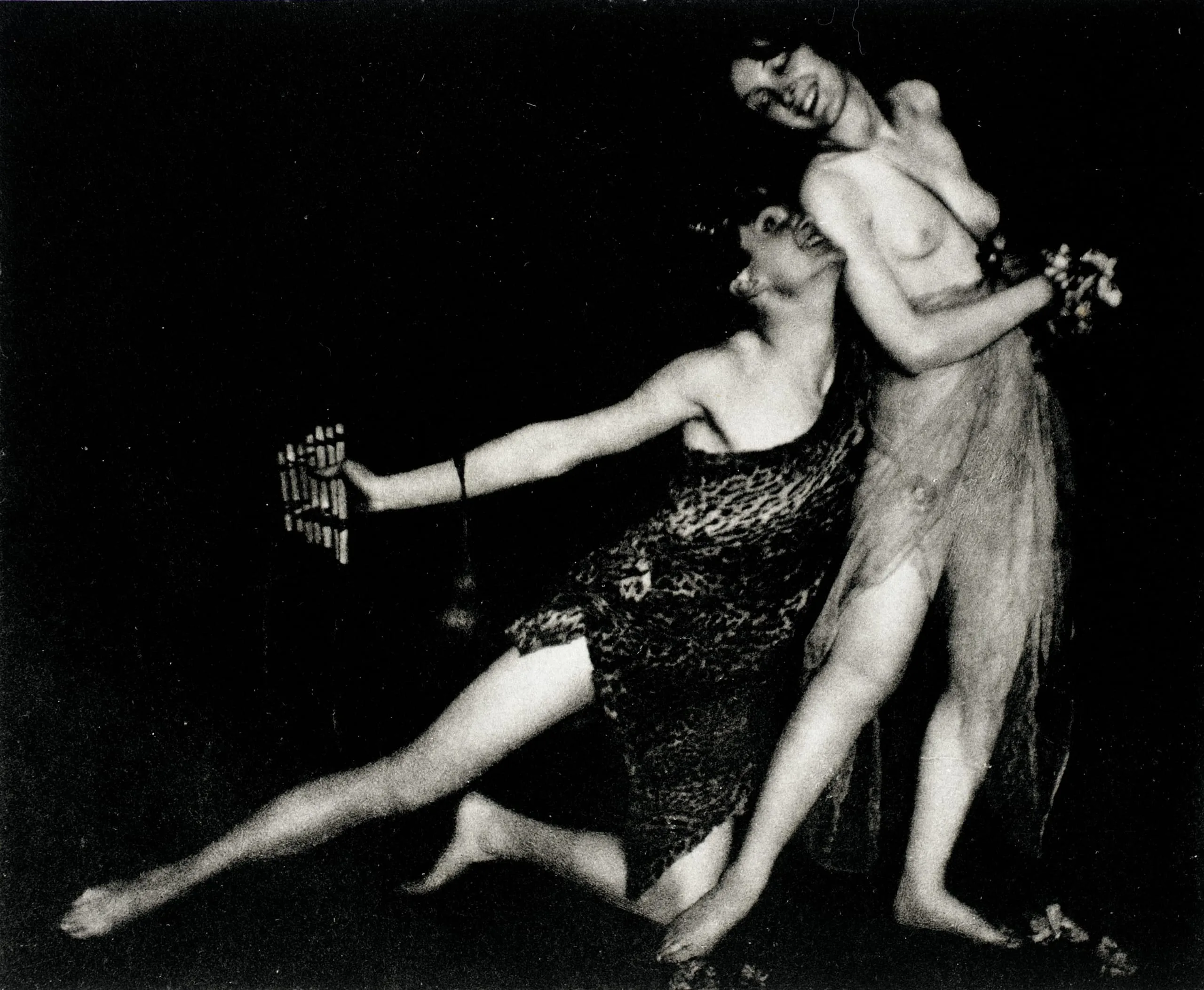 Black and white photograph of two women in costume — one in a leopard-print dress, one in a sheer skirt — posed together against a black background