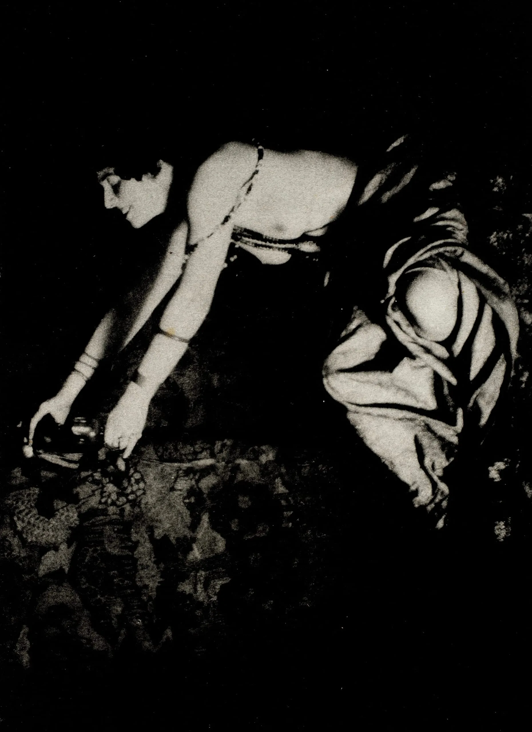 High-contrast mezzotint or photogravure print, two figures bending over a dark surface, bare shoulders illuminated against a black background