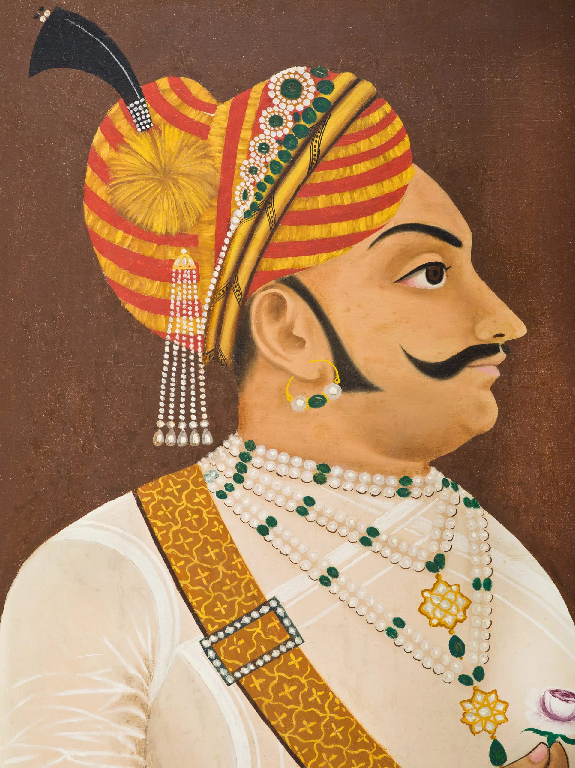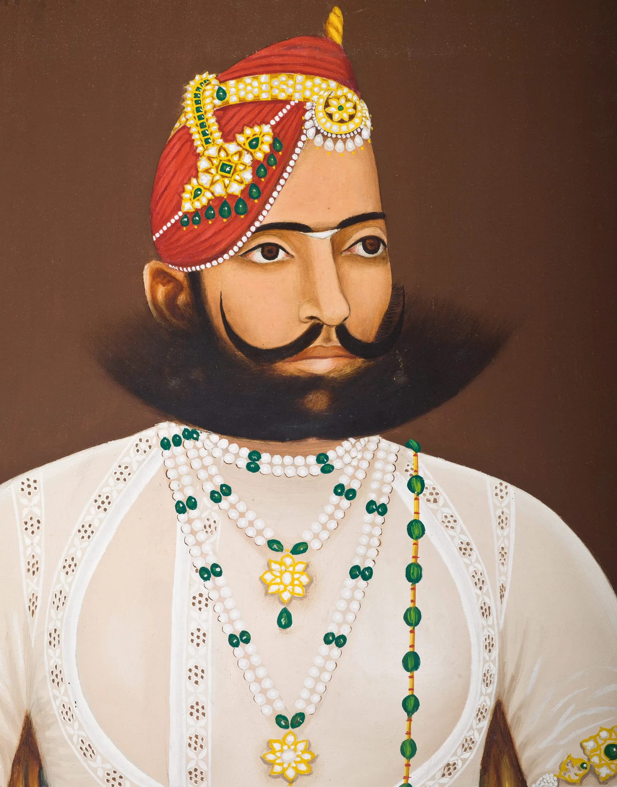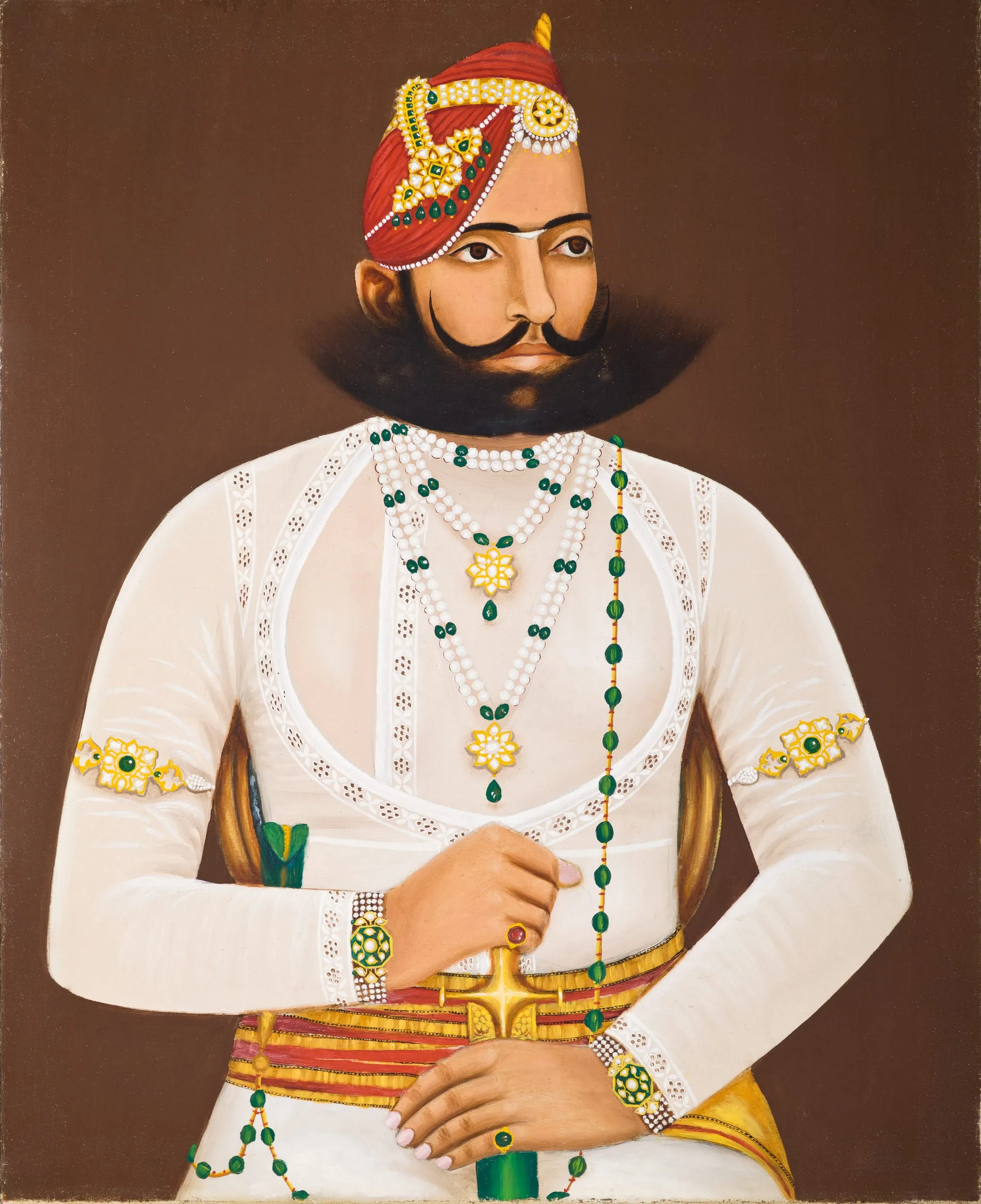 Sabal Singh has a fashionable flaring beard and moustache. He wears a turban with a jigha (turban ornament) on the side and a forehead ornament consisting of a circlet and pendant; pearl and emerald necklaces with bejeweled golden pendants; matching bracelets and armlets; and a western Indian upper garment called a puthia. He has a dagger sheath tucked into his waistbelt and holds a sword with a gilded hilt and scabbard fittings.